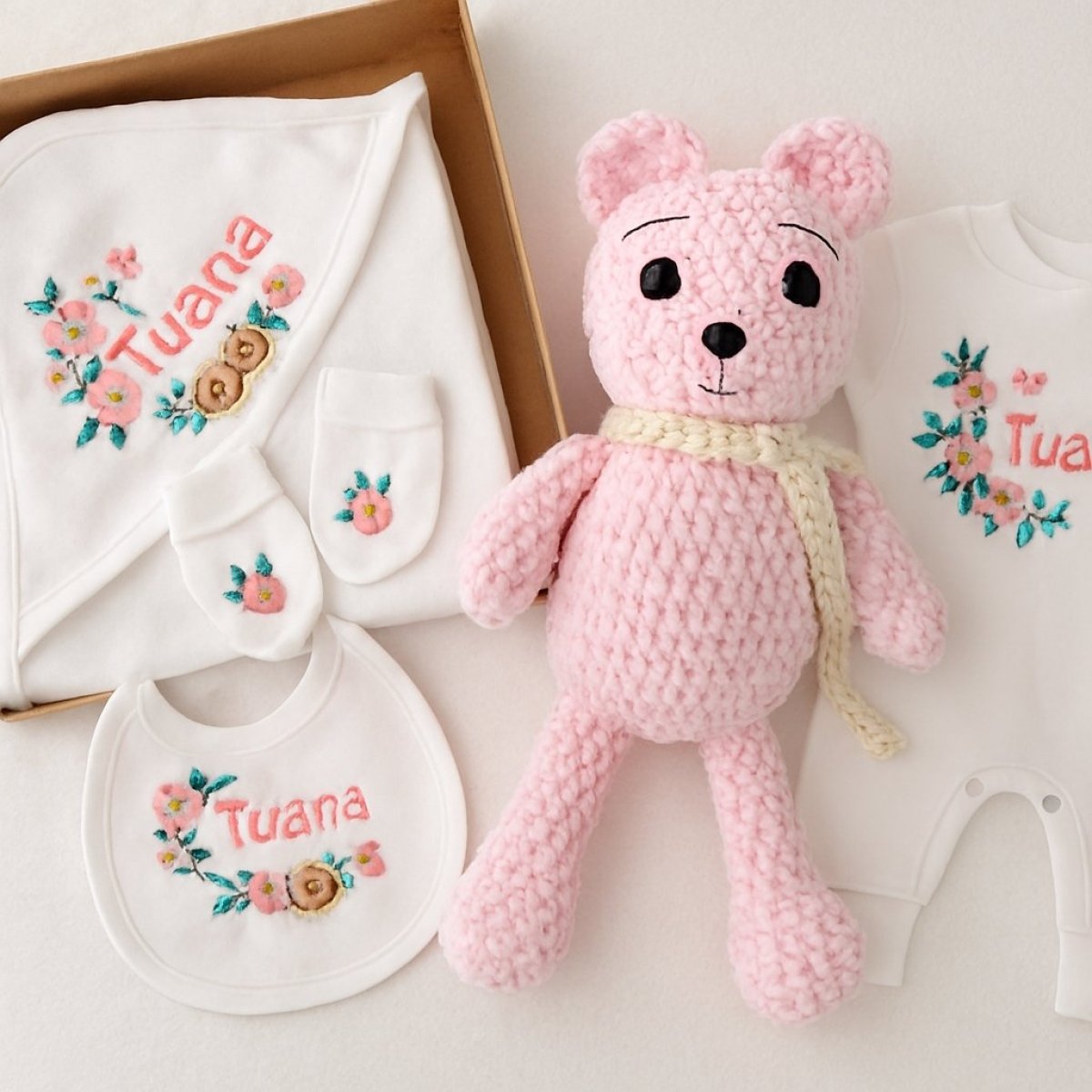 طقم مواليد مناسب جدا للسبوع او مناسبه كنسيه سالوبيت وكاب وشراب وجوانتى وكوفرته السالوبيت مطرز وجه وظهر بالاسم مع الورد وكذلك الكوفرته والكاب بورد فقط والبافت أيضا بلون روز وبيج واوف وايت Anew born set that is very suitable for sebou or church occasssion,consisting of,asleepsuit,romper,ahat,socks,gloves and receiving blanket.the sleepsuit embrodiered on the front and back with the name and flowers,as is the receiving blanket.the hat embrodiered with flower only and the bib also included is available in pink,beige and off-white