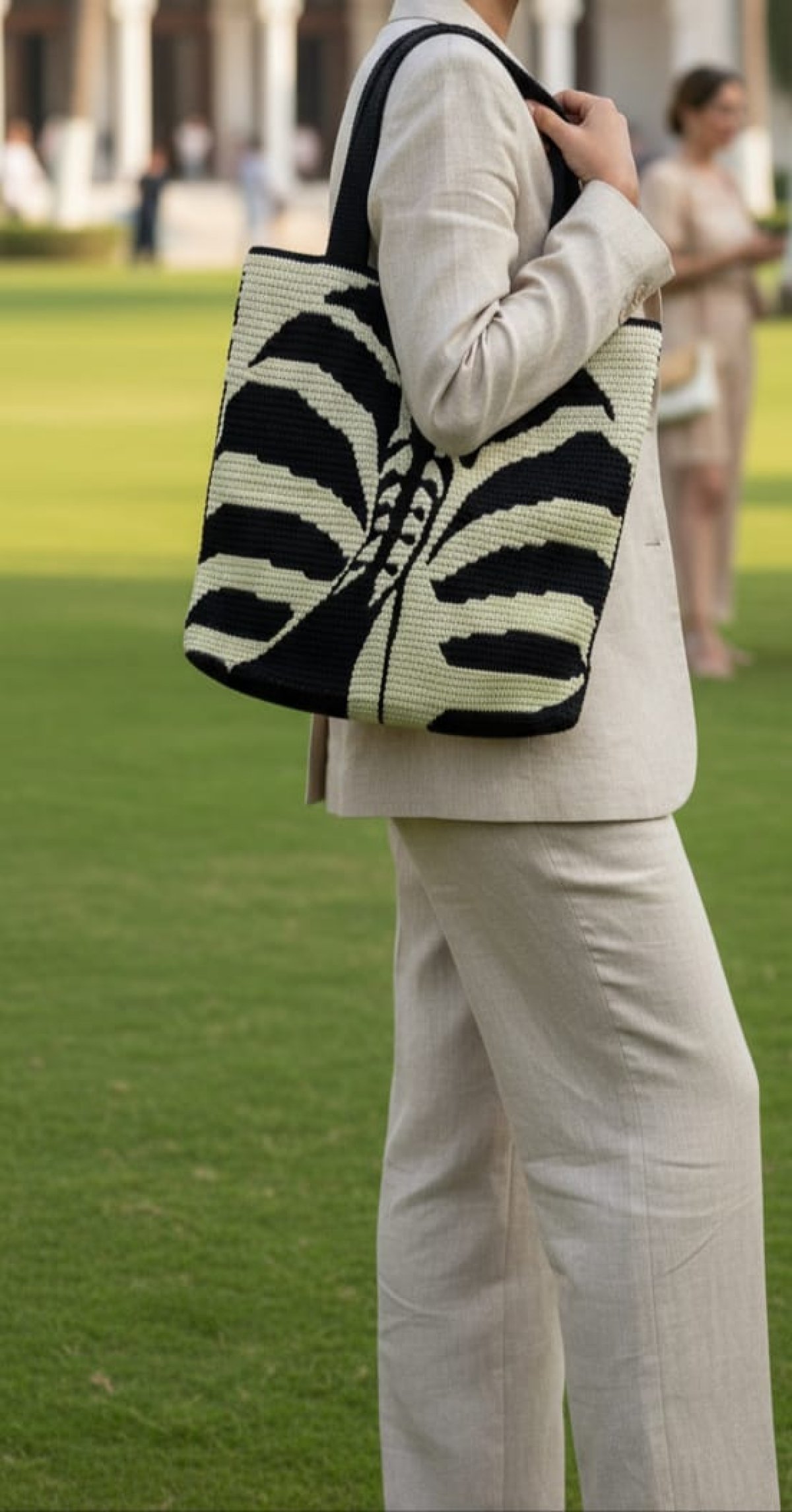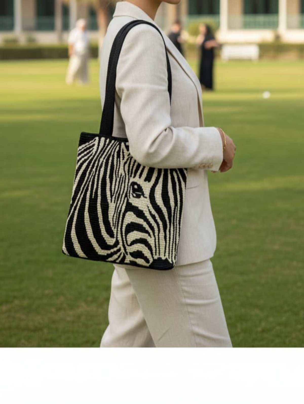شنطة موزاييك برسمة الحمار الوحشي 100%قطن مبطنة من الداخل لها جيب بسوستة واخر بدون سوستة مقاس 38*36سم