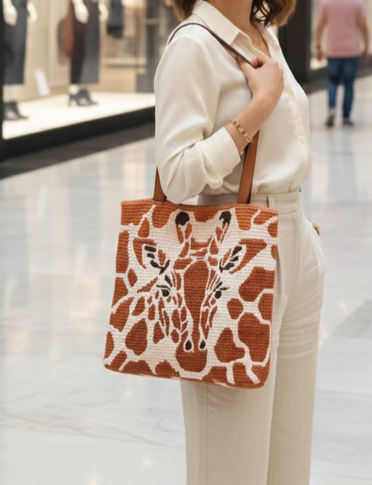 شنطة موزاييك برسمة الزرافة قطن تركى مبطنة من الداخل لها جيب بسوستة واخر بدون سوستة يد جلد طبيعي مقاس 32*34سم
