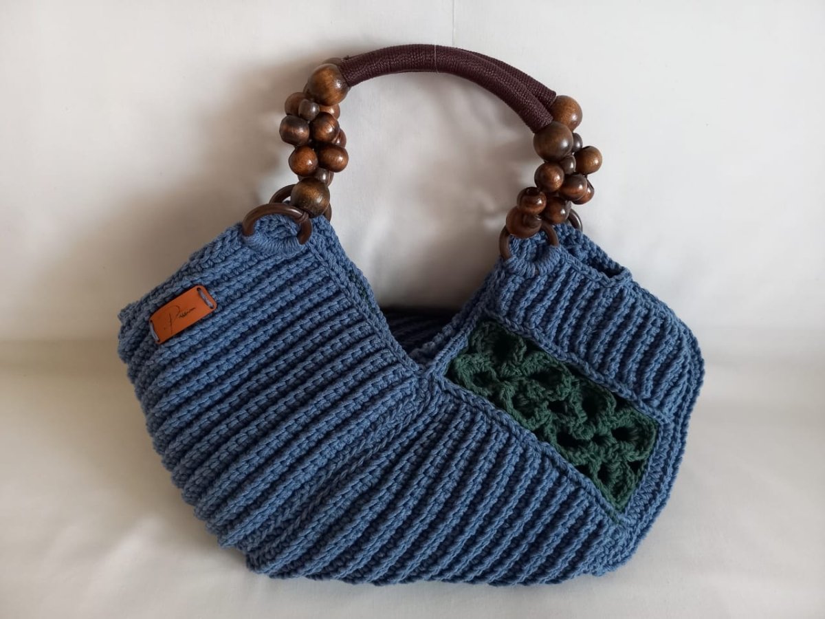 شنطة كروشيه موديل الطاحونة بيد خرز خشب طول ٣٥ سم عرض ٤٠ يم طول اليد ٤٤ سم خيط قطن مكرمية لون ازرق بورد أخضر
