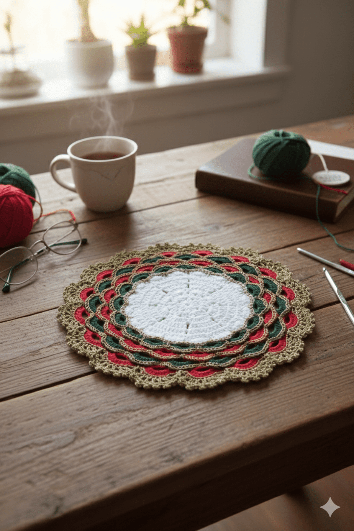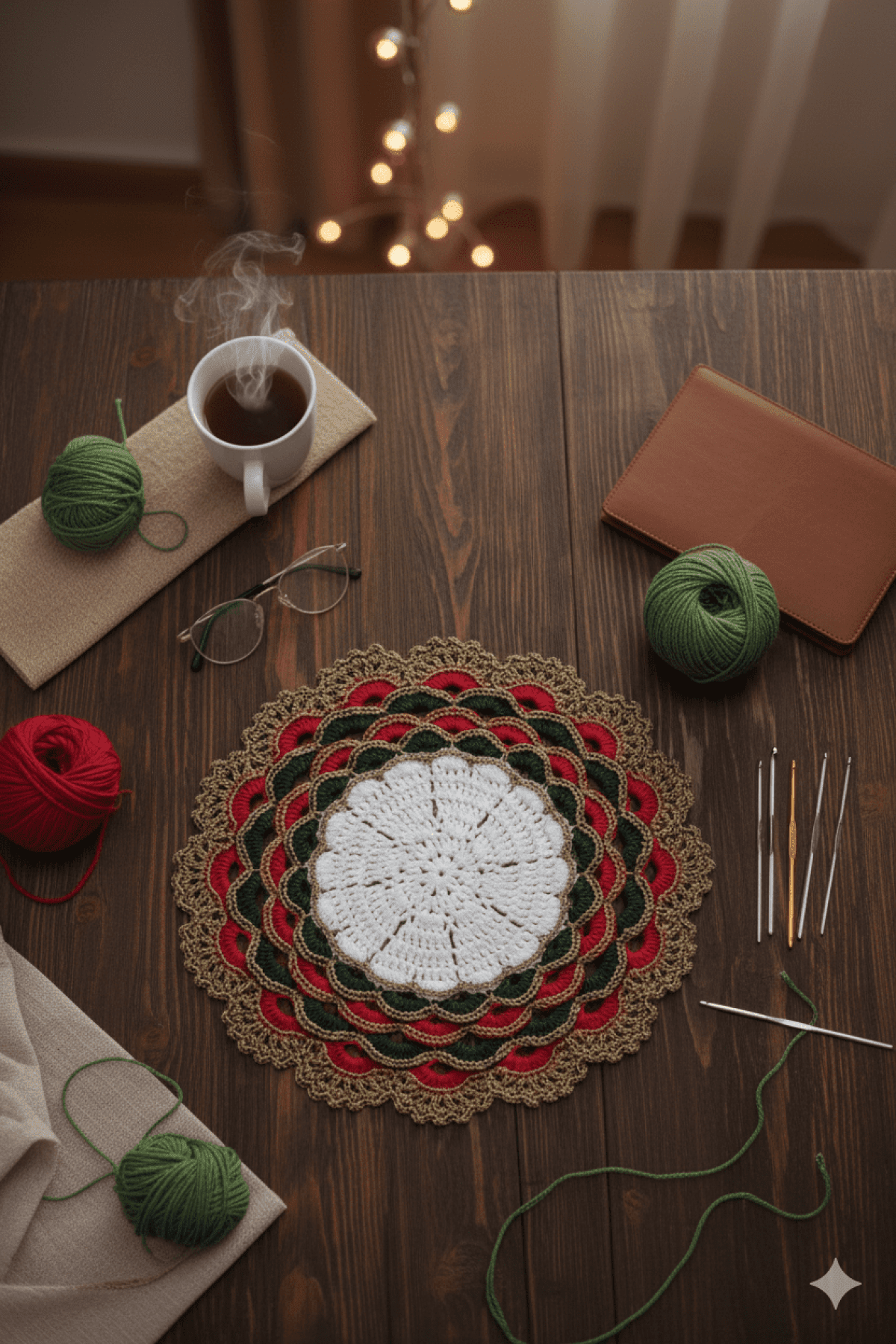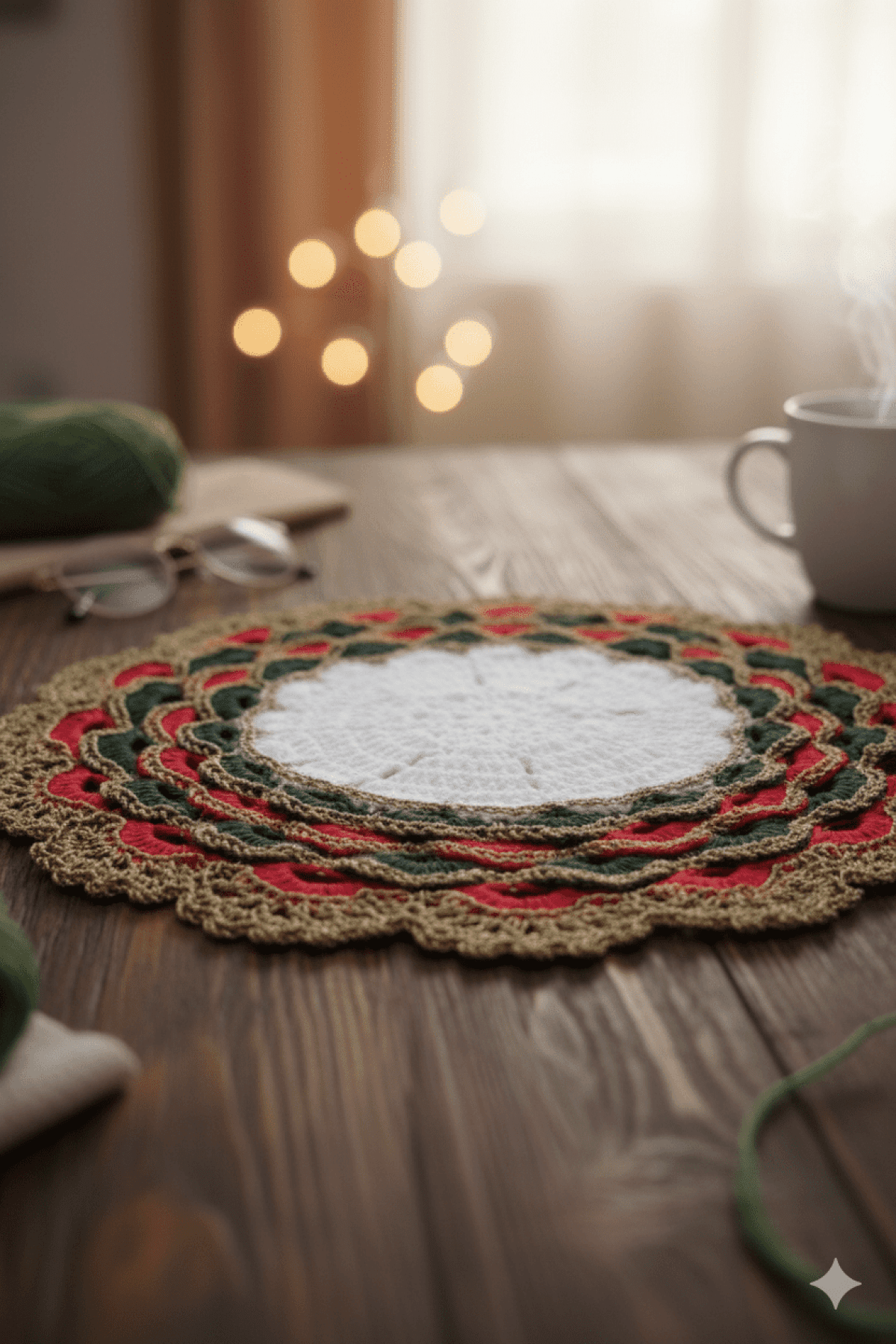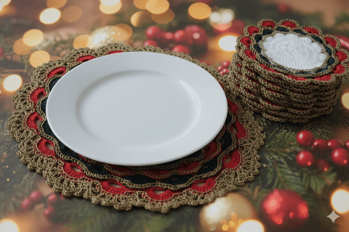 مفارش سفره كروشيه مناسبه للكريسماس قطر٣٧سم أنيقه تجعل الطاوله مفعمه بالحيويه لوضع الأطباق عليها تداخل الألوان مبهج الابيض والأحمر الأخضر والذهبي Christmas-themed crochet table Mats,37cm in diameter, elegant and designed to bring vibrancy to the table for serving dishes.the cheerful interplay of colors white, red,green and gold adds festive touch.