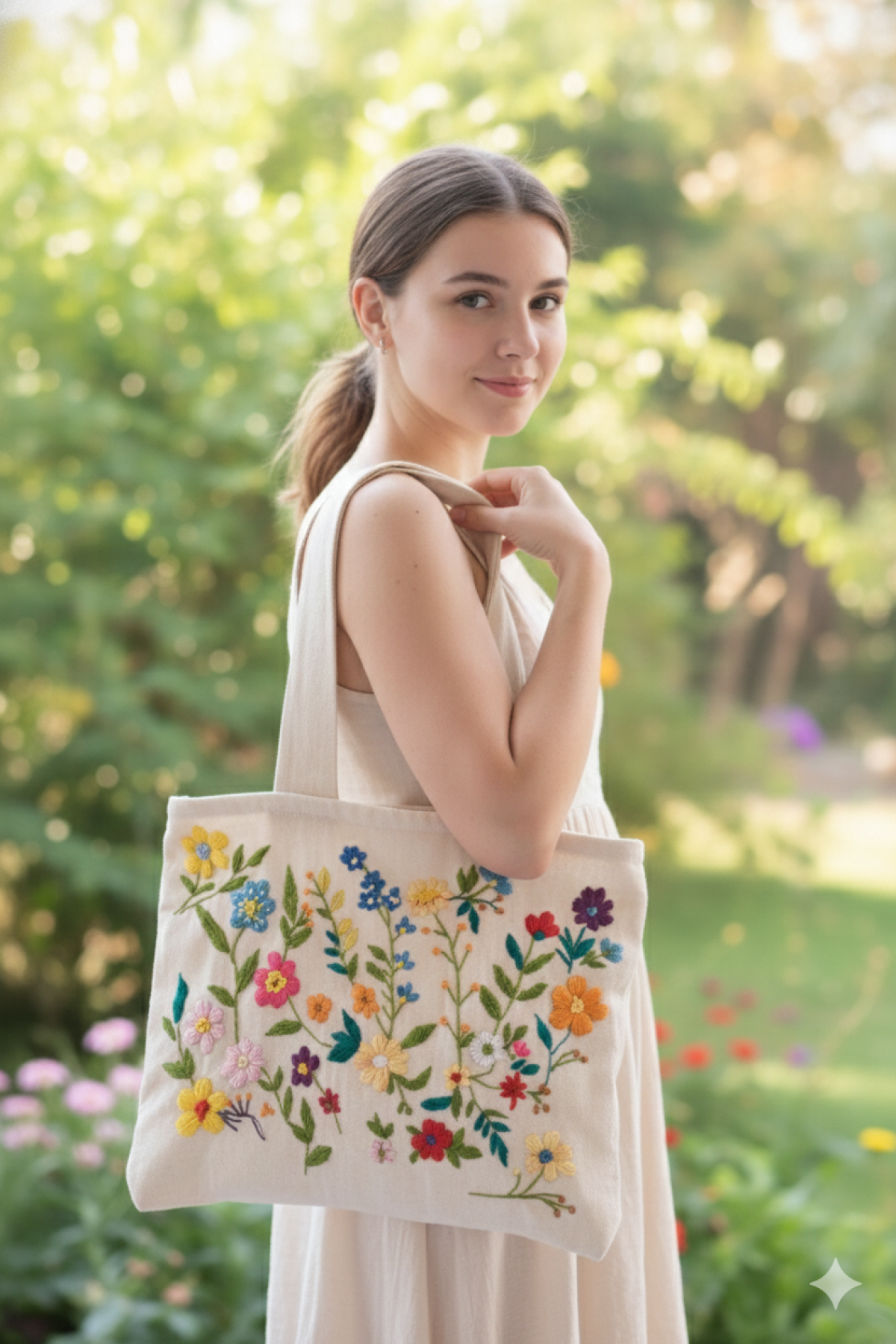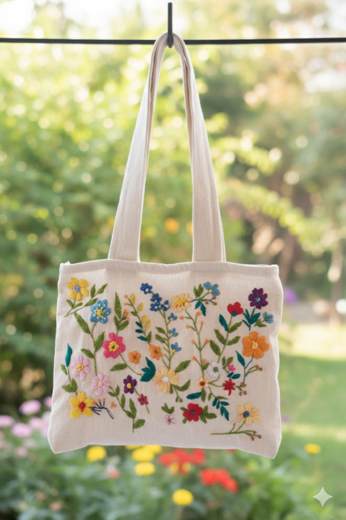 شنطه قماش بدون سوسته مقاس ٣٠*٢٠ بيد قماش عريضه مطرزه تطريز يدوي وردات مختلفه الحجم واللون وفروع خضراء تتب, اين ألوانها بين الأخضر الفاتح والغامق Fabric bag without zipper, size 30*20cm,with wide fabric handles hand-embroidered with flowers in different sizes and colours, along with green branches varying between tight and dark shades