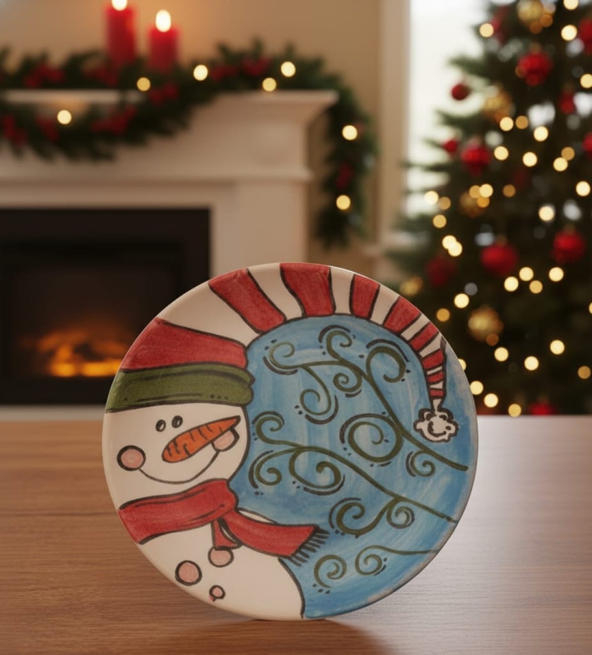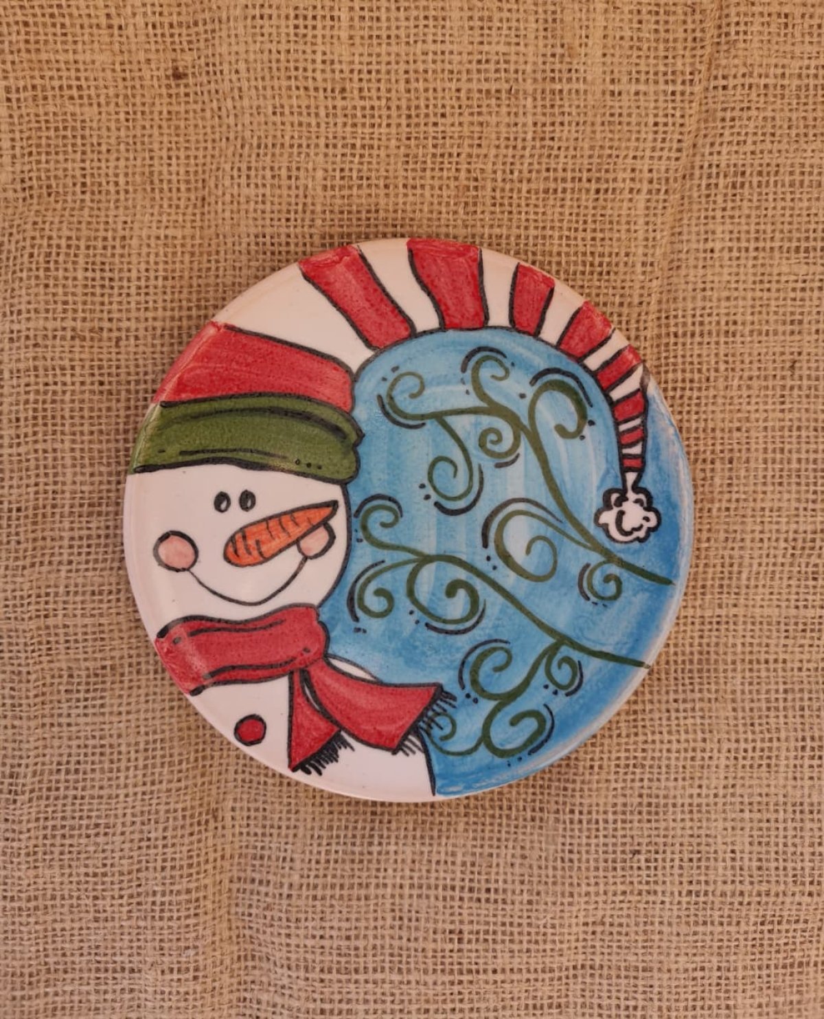 طبق خزفى دائرى قطر 16 سم ، مزخرف بشكل رجل الثلج تم صناعته فى أفران خزفية على درجات حرارة عالية تضمن ثبات الطبقة اللونية، صحى وآمن للاستخدام فى الطعام، أو التعليق كديكور، ويمكن تنظيفه بالمنظفات دون أى تأثير على بريق ولمعان الألوان كما يمكن دخوله للميكرويف