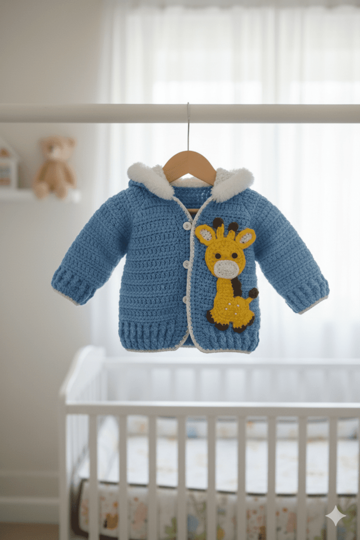جاكيت طفل عمر متاح تنفيذ حسب السن كروشيه بكابيشو على الطرف فرو مزين بزرافه كروشيه ومعه شراب Children's jacket,available to be made according to age,crochet with ahood fur trim on the edge, decorated with acrochet giraffe, and comes with matching socks.