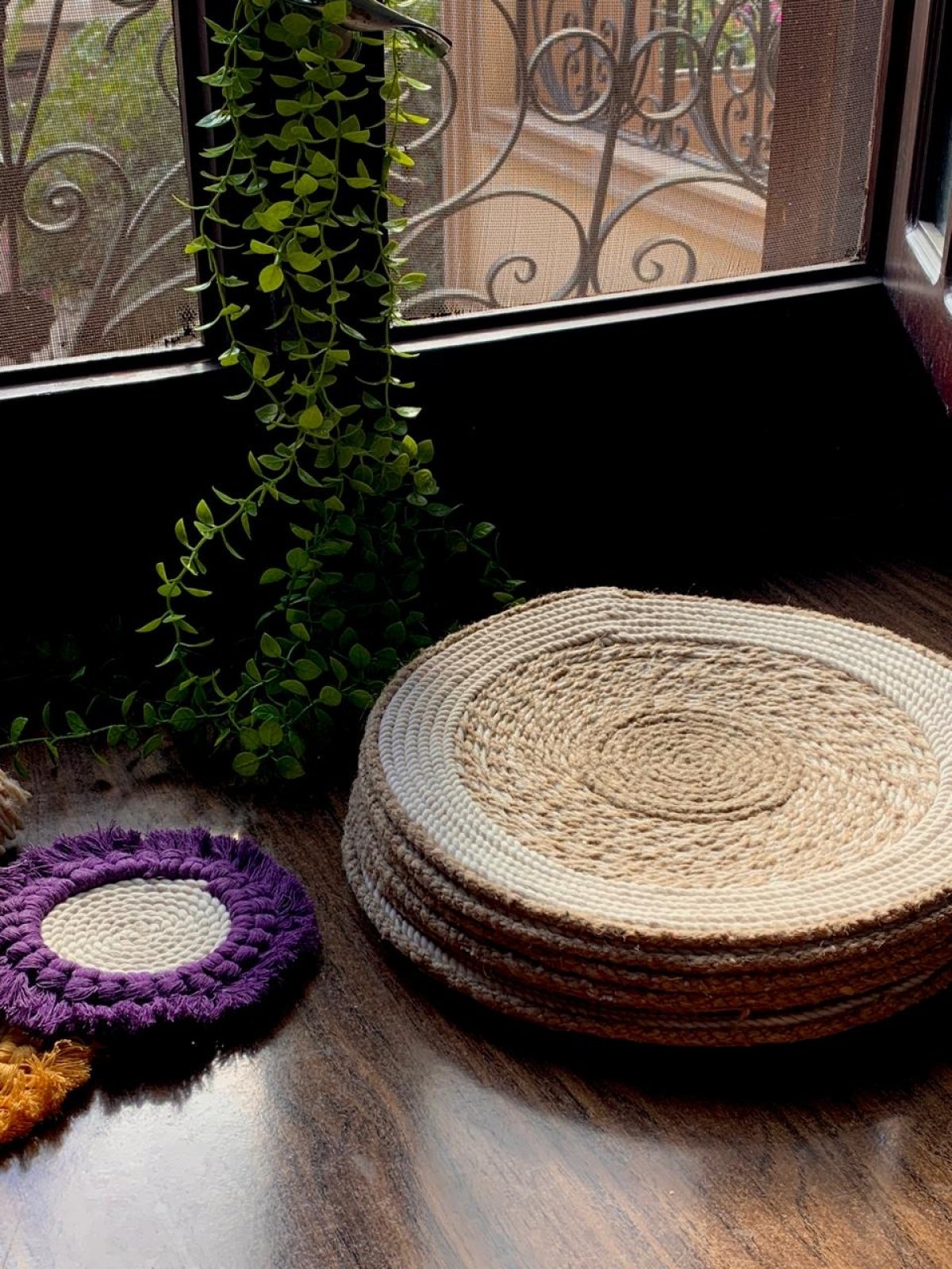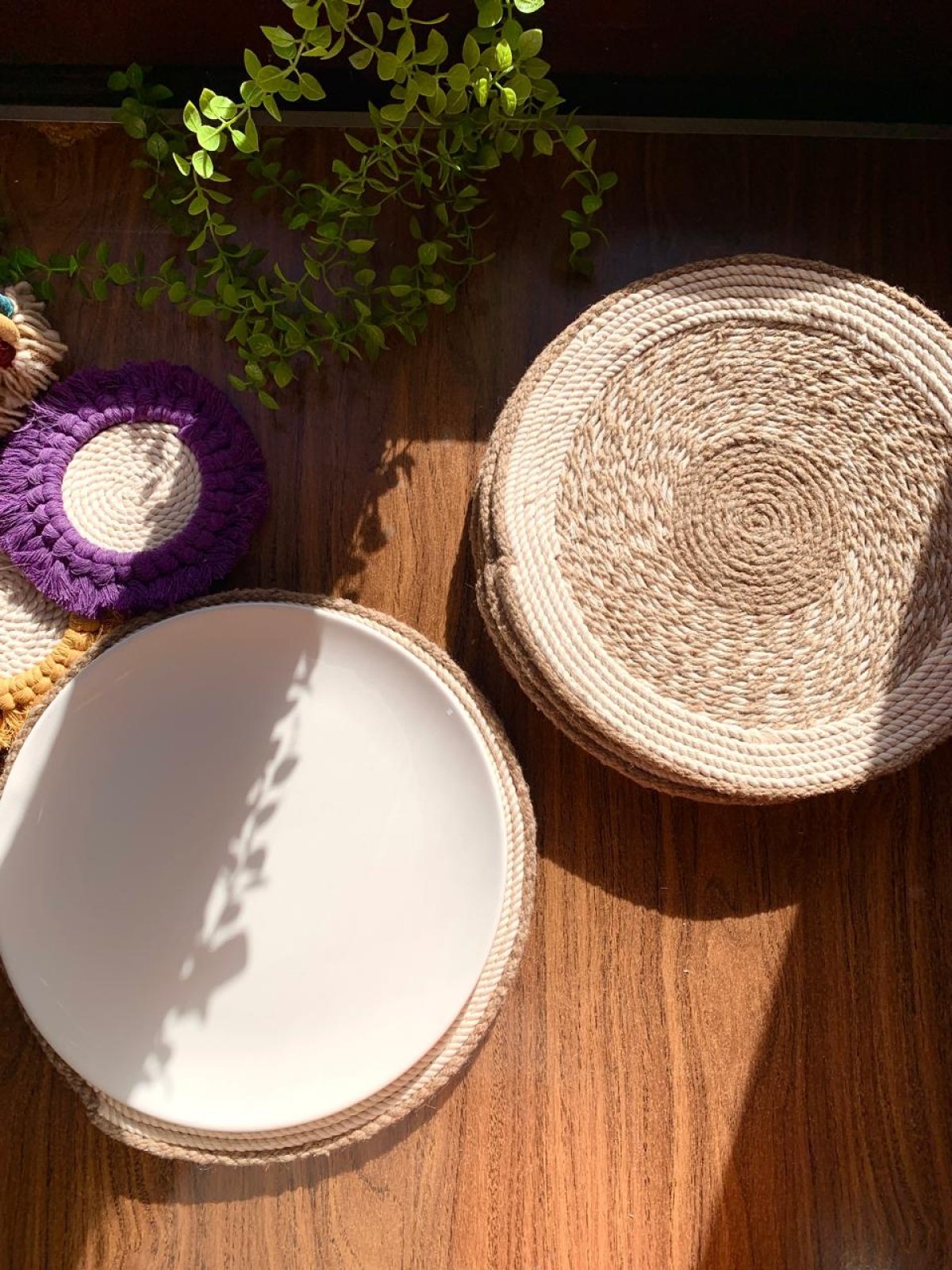 مجموعة من ٦ كوسترات للاطباق من خيط خيش في مكرمية مقاس ٣٠سم