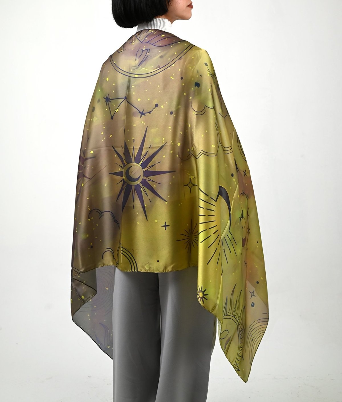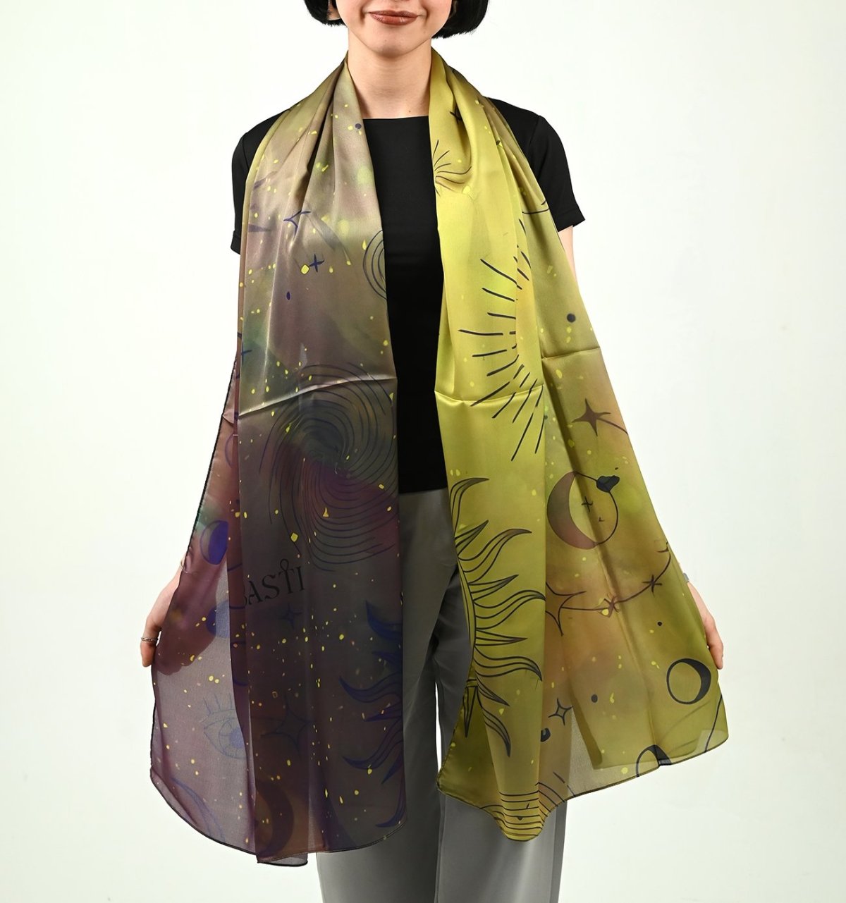 Inspired by the infinite beauty of the cosmos, this luxurious artistic scarf showcases refined space motifs reminiscent of distant galaxies, shimmering stars, and celestial movement. The design transforms cosmic inspiration into a sophisticated statement of elegance and depth. Crafted in silk, chiffon, and satin, each fabric enhances the artwork with a distinctive character: Silk envelops the design in a rich, fluid drape with a timeless, opulent feel Chiffon offers a delicate lightness, creating an ethereal and graceful presence Satin reveals a luminous sheen that elevates the scarf with polished refinement Designed for those with a taste for exclusivity and artistic expression, this scarf is more than an accessory—it is a luxurious interpretation of the universe, meant to be worn with confidence and distinction. Size: 200 x 75 cm