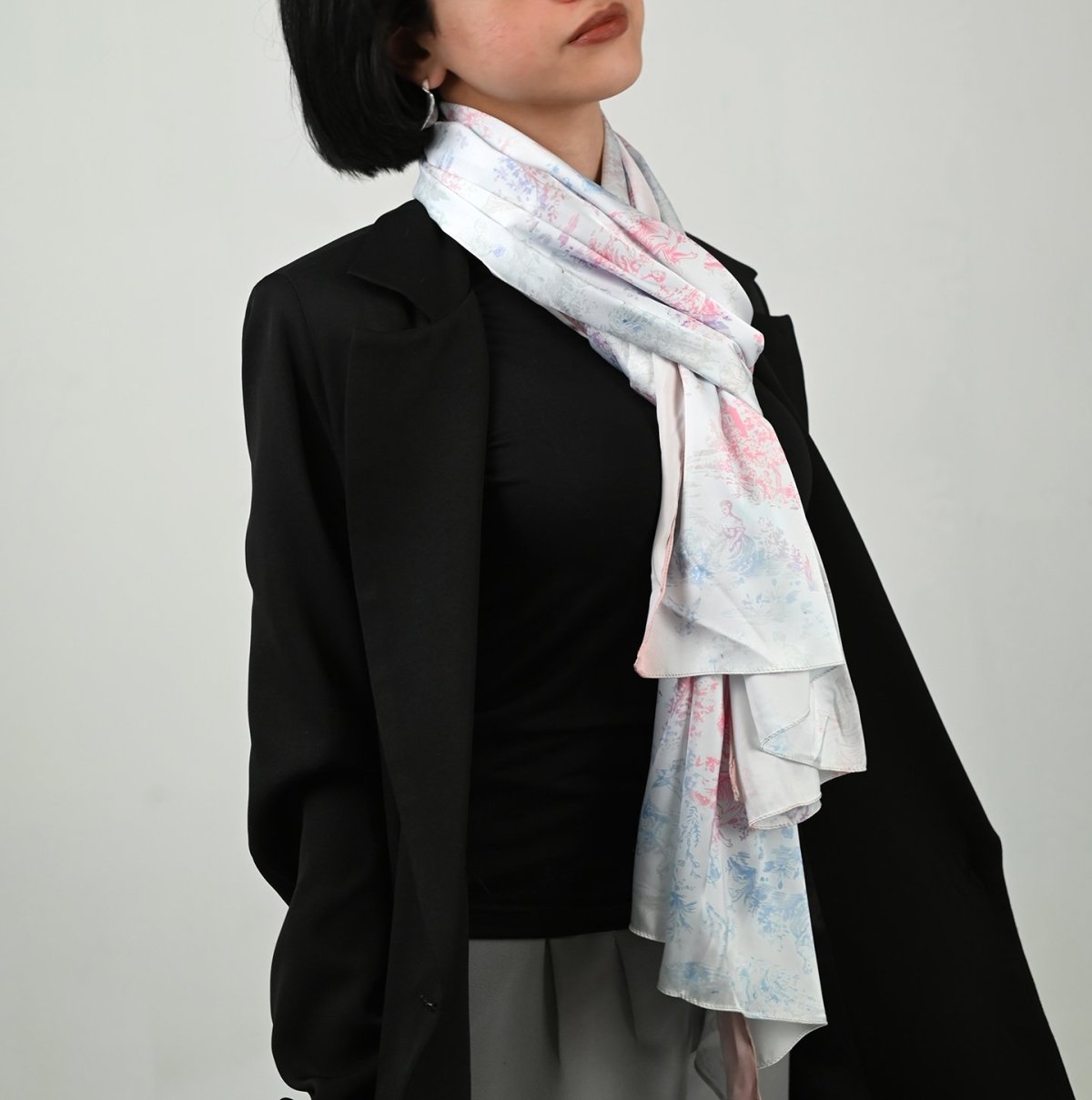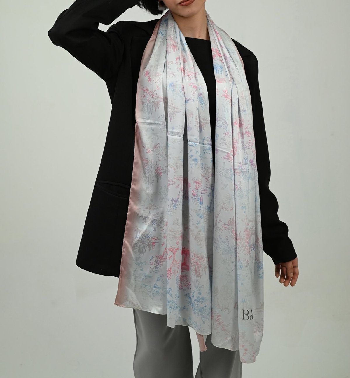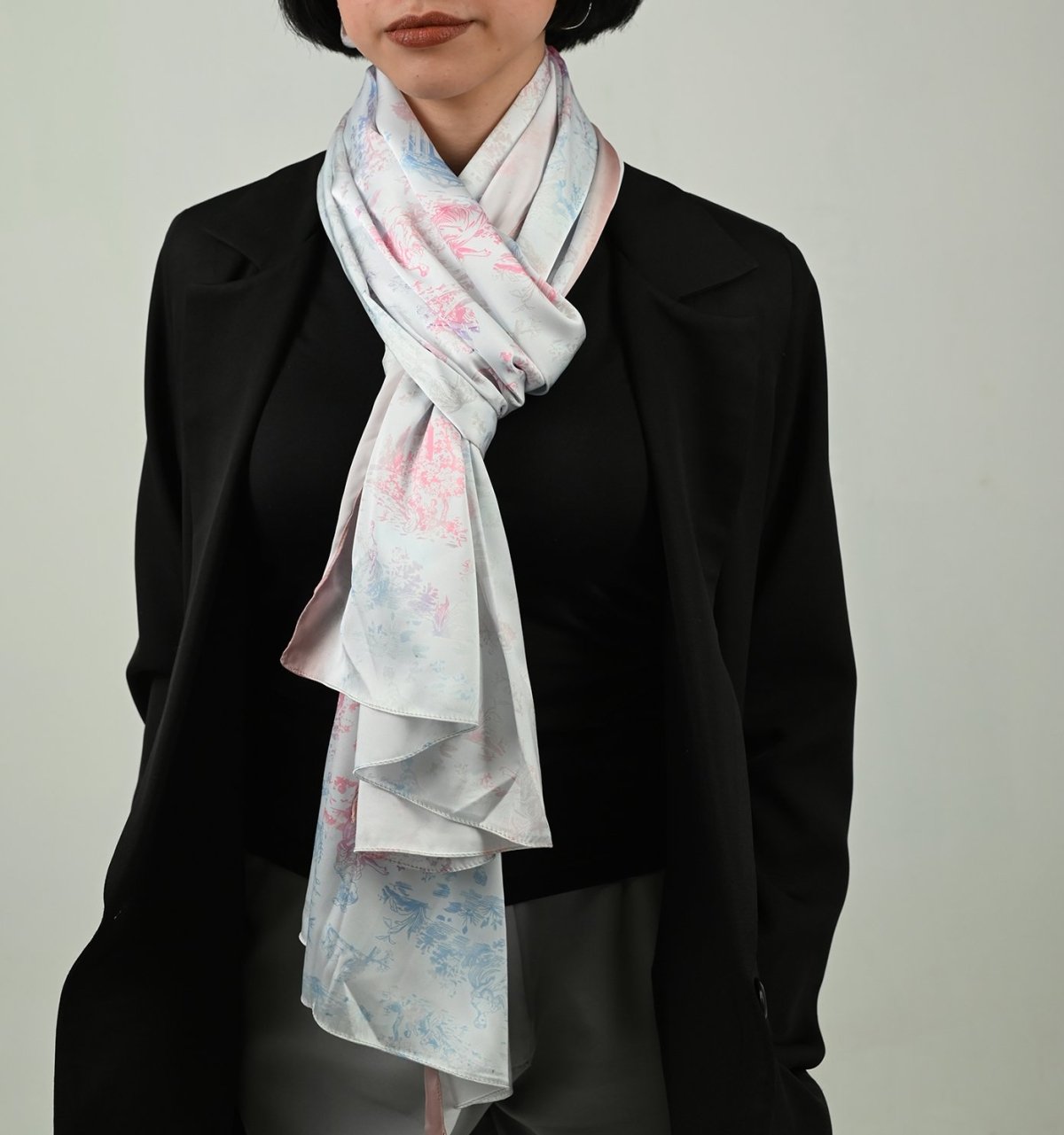 Inspired by the elegance of the Romantic era, this artistic scarf features delicate motifs drawn with graceful detail, evoking a sense of poetry, emotion, and classic beauty. The design reflects the artistry of a bygone age, reimagined as a sophisticated piece of wearable art. Available in silk and satin, each fabric enhances the motifs with its own character: Silk offers a smooth, fluid drape with rich depth and timeless luxury Satin reveals a subtle sheen, creating a polished and refined finish Designed for those who appreciate romantic aesthetics and artistic expression, this scarf brings together heritage, elegance, and modern femininity in one exquisite accessory. Size: 200 x 75 cm