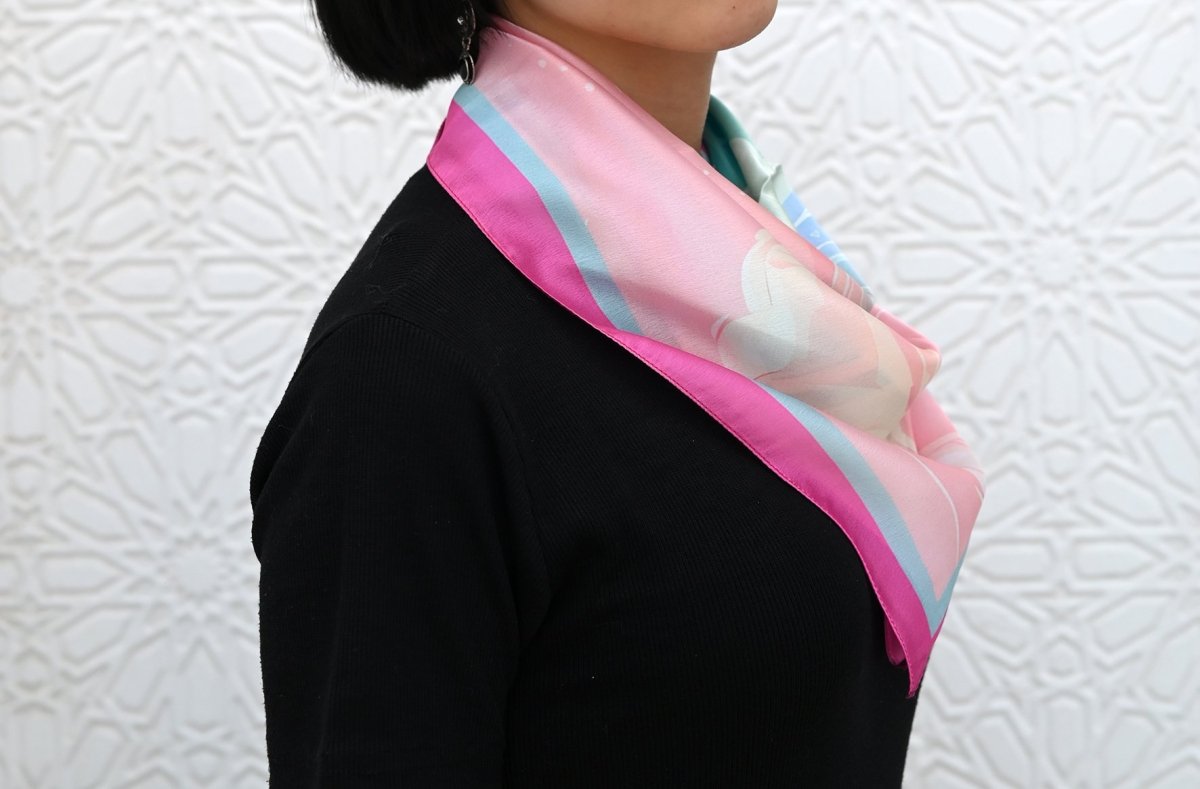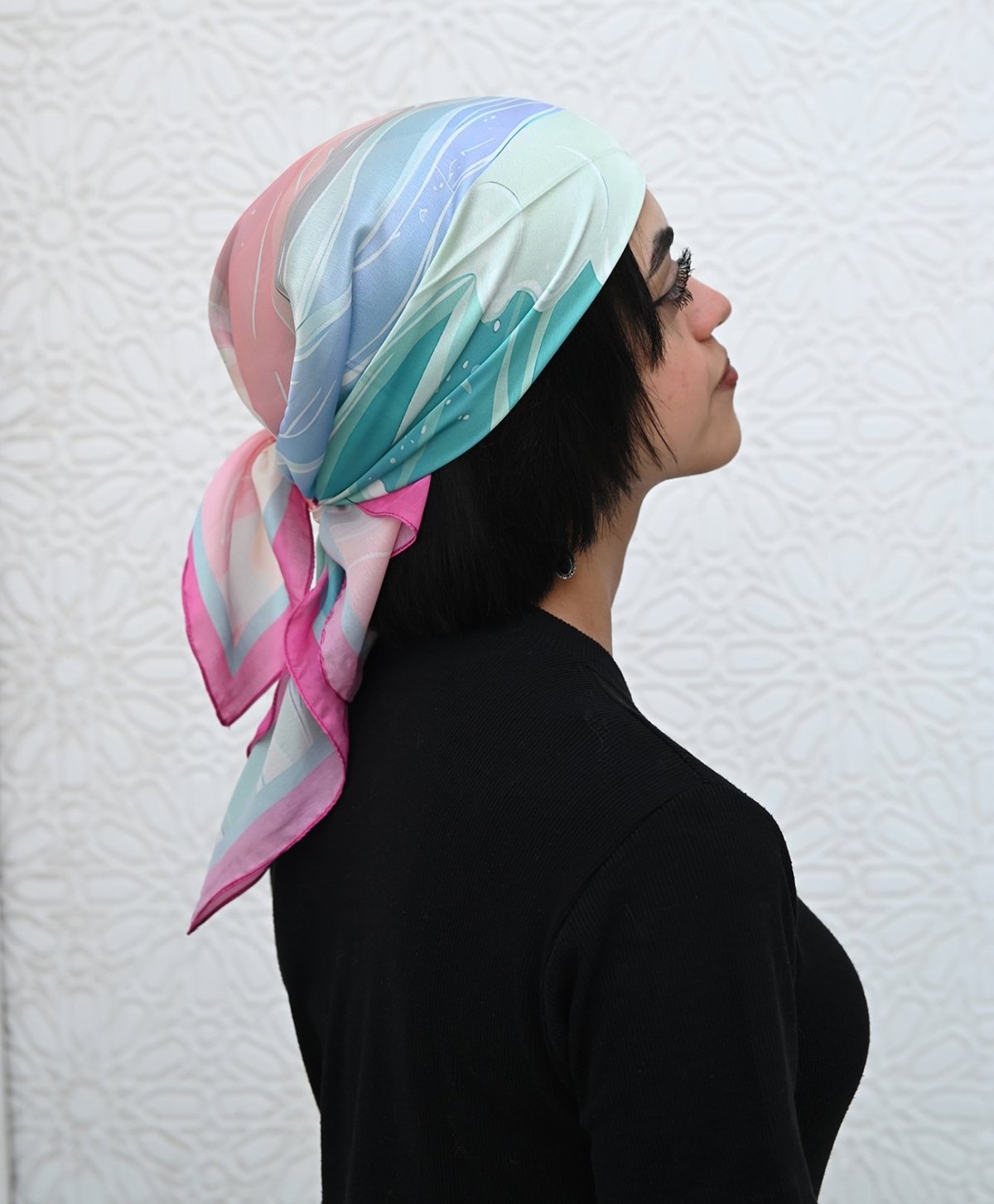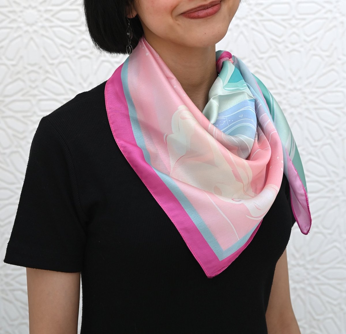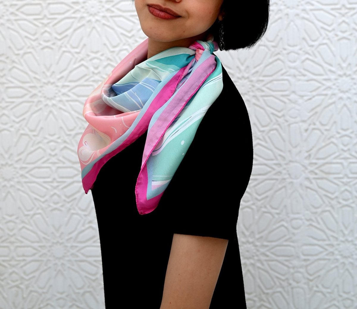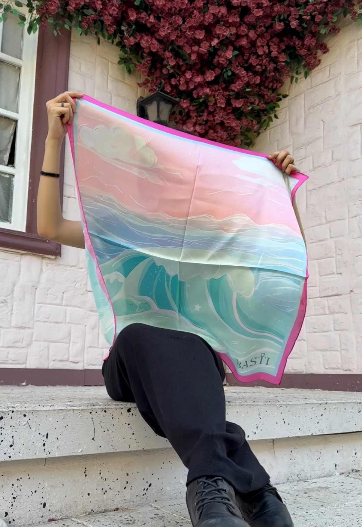 Inspired by the rhythm and movement of the sea, this artistic square scarf features an abstract sea wave drawing that captures fluid motion and contemporary elegance. The design blends soft curves and dynamic lines, transforming ocean energy into a refined piece of wearable art. Measuring 75 × 75 cm, the square shape offers versatile styling—from classic neck ties to elegant head or bag accents. Available in silk and satin, each fabric elevates the artwork beautifully: Silk provides a smooth, fluid drape with rich color depth and natural luminosity Satin adds a subtle sheen and refined structure for a polished finish Designed for those who appreciate modern artistry and timeless sophistication, this scarf brings ocean-inspired abstraction into a luxurious, statement accessory.