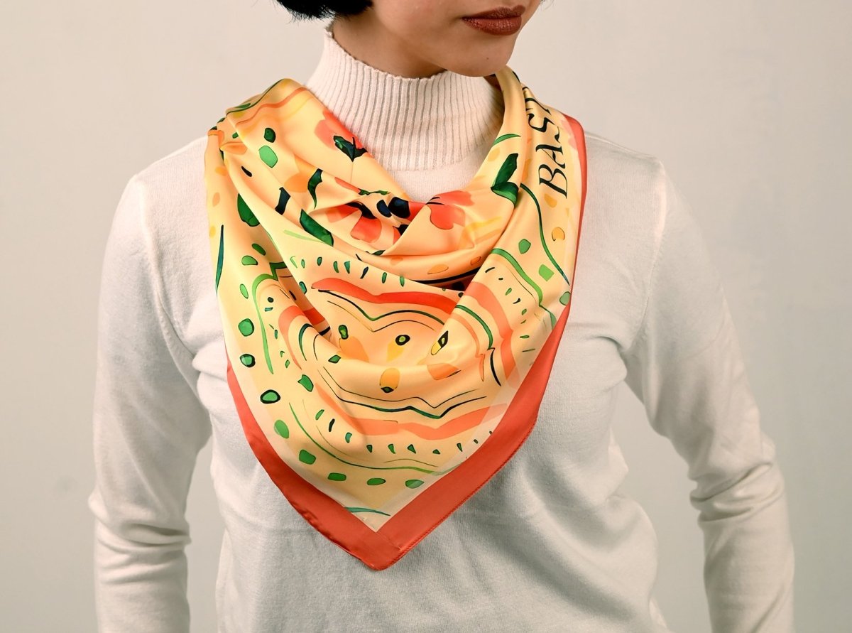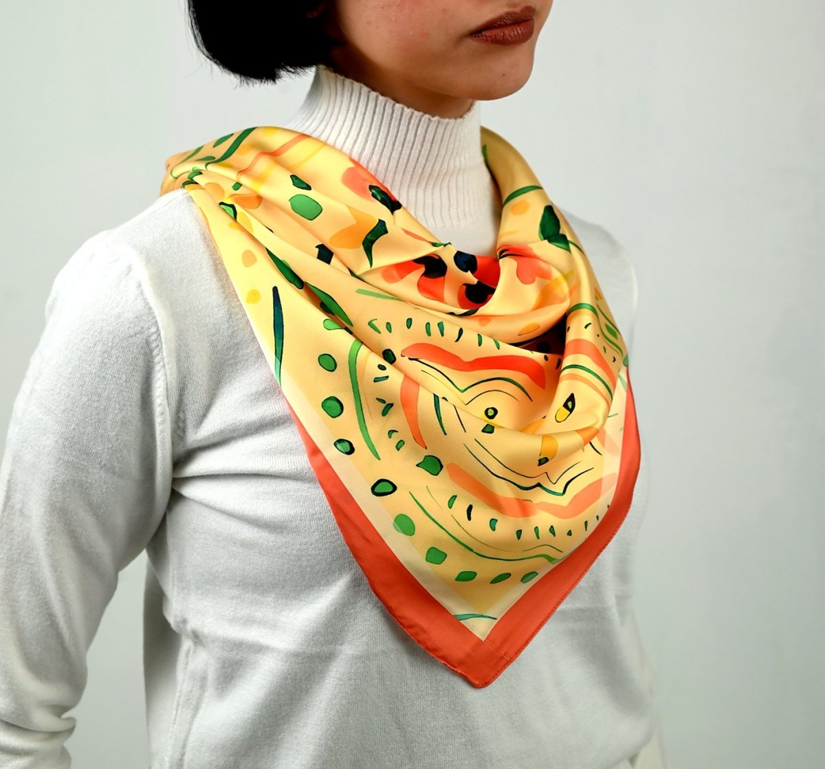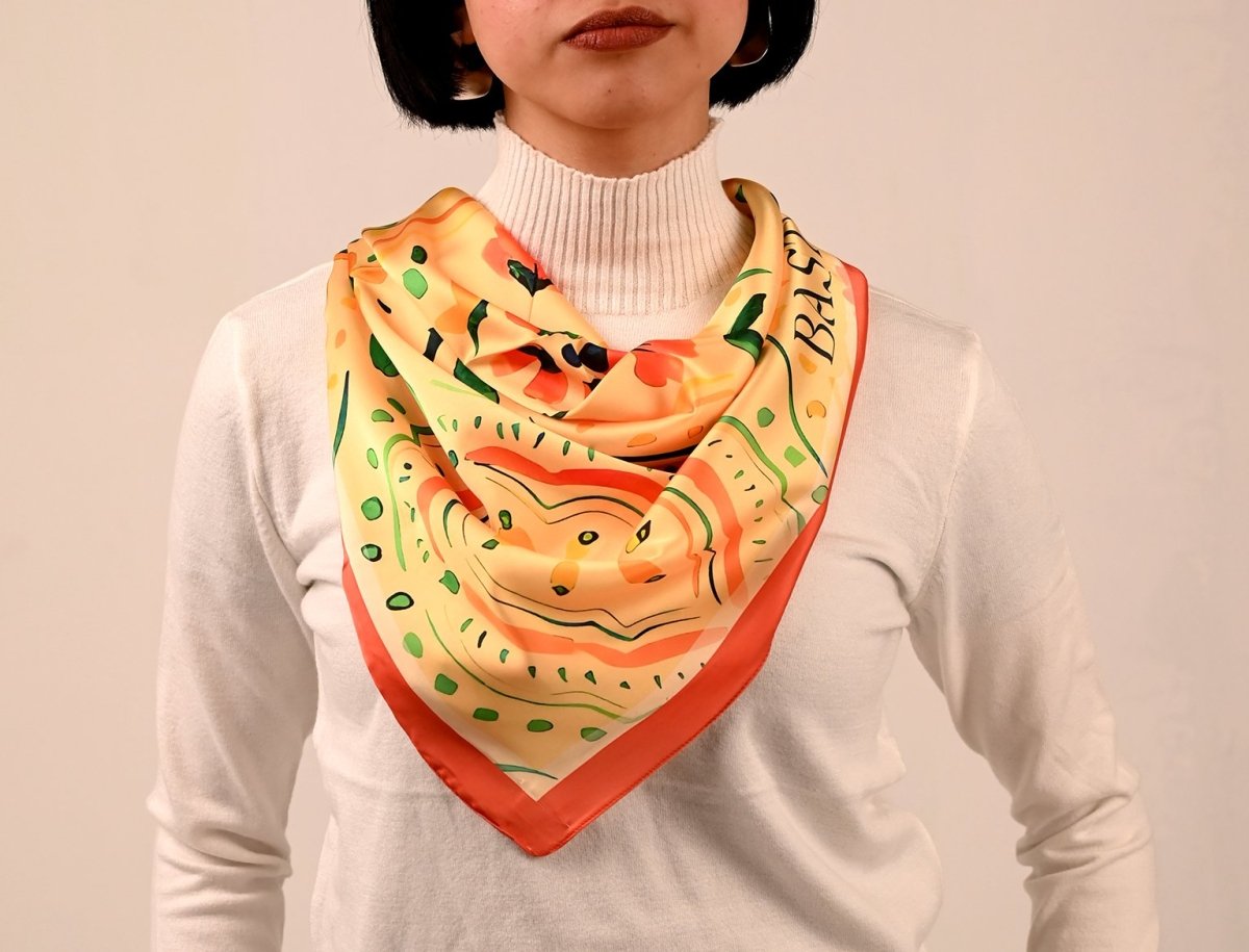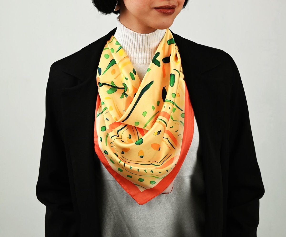 Elegant and timeless, this artistic square scarf features intricate beige oriental ornaments, blending classic patterns with modern sophistication. The design captures the beauty of traditional artistry while transforming it into a contemporary, wearable statement. Measuring 75 × 75 cm, the square shape allows versatile styling—perfect as a neck wrap, headscarf, or chic bag accessory. Available in silk and satin, each fabric elevates the design: Silk offers a smooth, flowing drape with natural luminosity and refined elegance Satin provides a soft sheen and structured finish for a polished, luxurious look Designed for those who appreciate heritage-inspired artistry and understated sophistication, this scarf is a statement of elegance and timeless style.