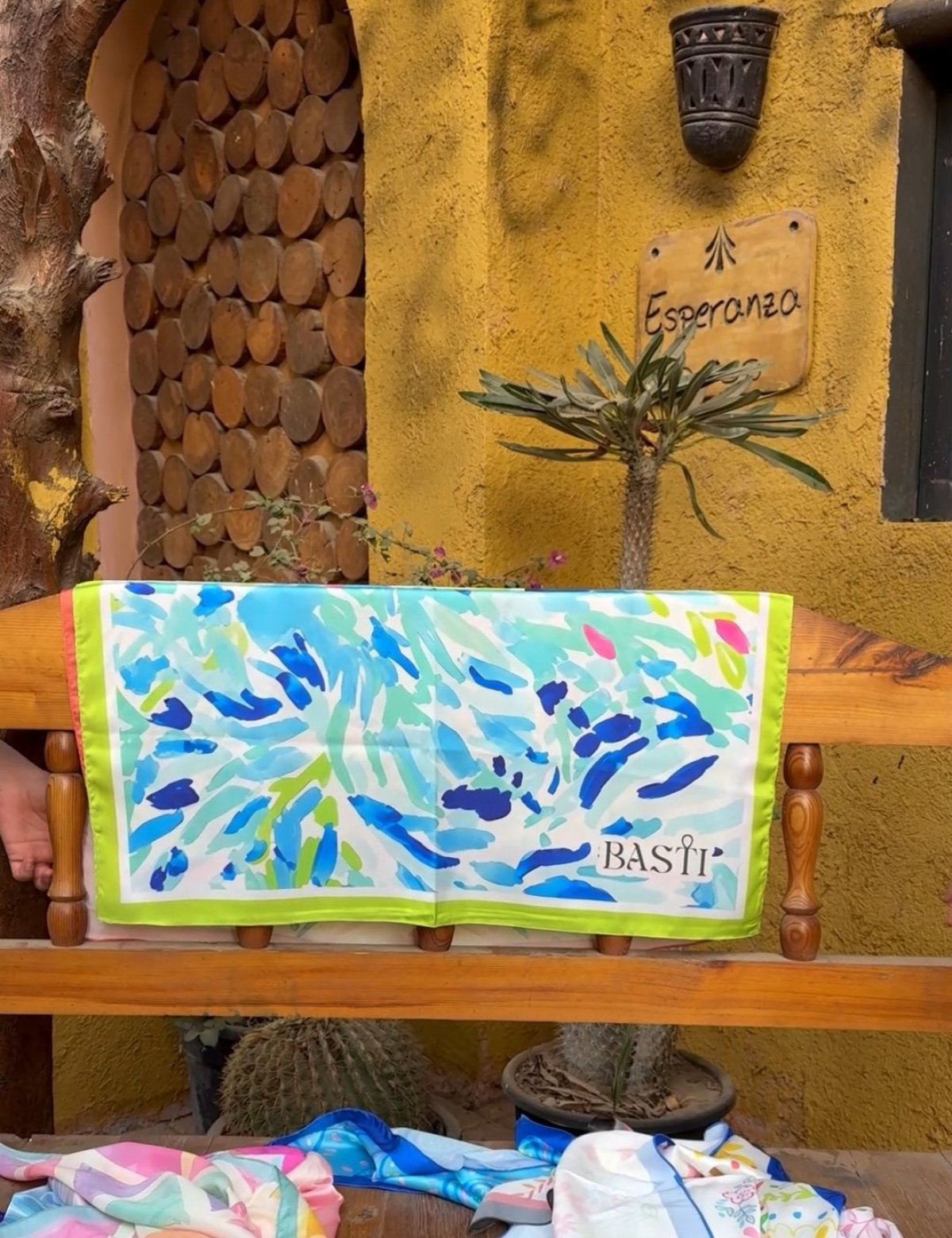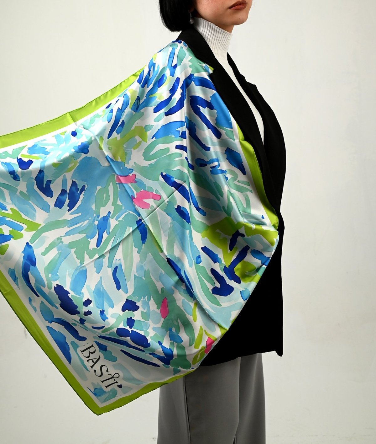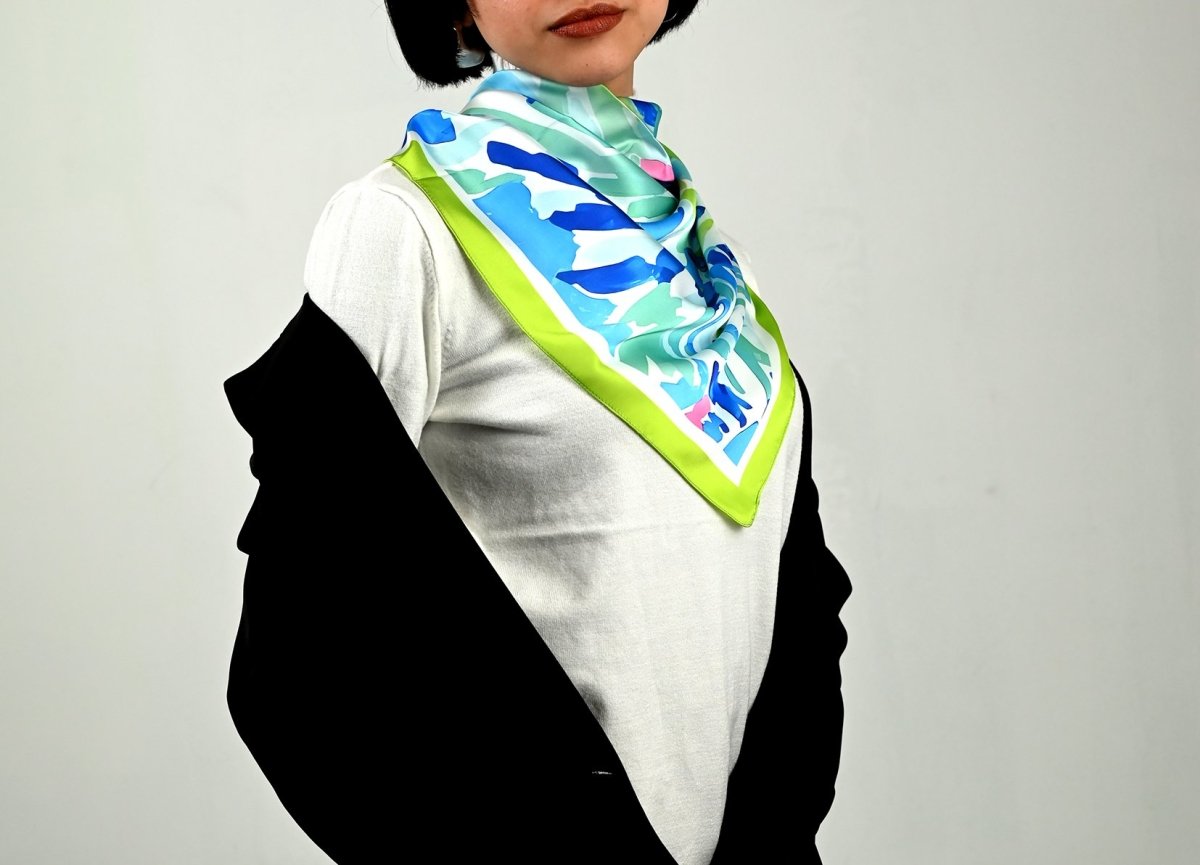 Elegant and serene, this artistic square scarf features a fluid watercolor design in soothing shades of blue, evoking the tranquility of sky and sea. Its abstract, flowing pattern transforms art into a refined, wearable accessory. Measuring 75 × 75 cm, the square shape allows versatile styling—perfect for neck wraps, headscarves, or chic bag accents. Available in silk and satin, each fabric enhances the artwork beautifully: Silk offers a smooth, flowing drape with luminous color depth and natural elegance Satin provides a soft sheen and structured finish for a polished, sophisticated look Designed for those who appreciate subtle artistry and timeless elegance, this scarf brings calm sophistication and modern artistry to every outfit.
