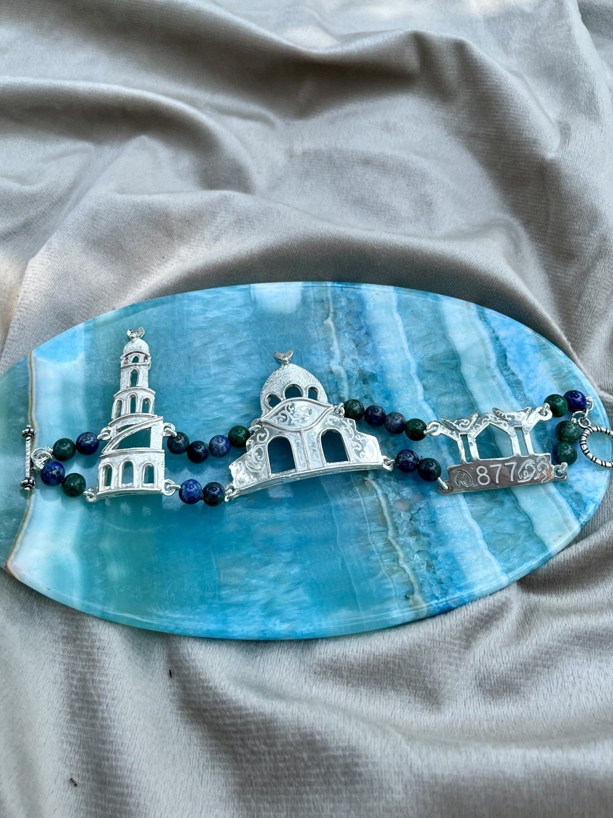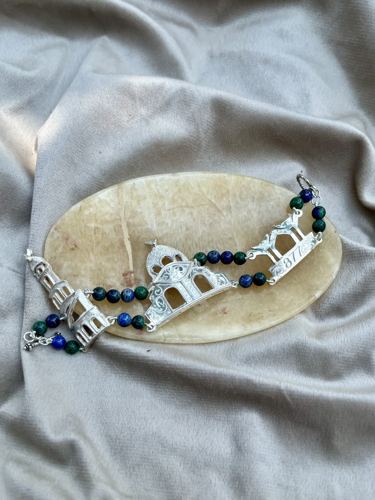 اسورة فضيّة لهندسة مسجد ابن طولون الخالدة أُعيد تخيّلها في قطعة مصغّرة، مُزيّنة بالعقيق، حيث يلتقي التراث بالأناقة
