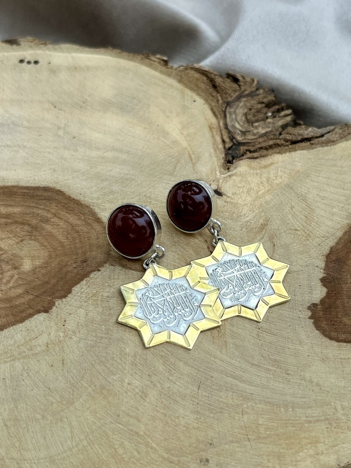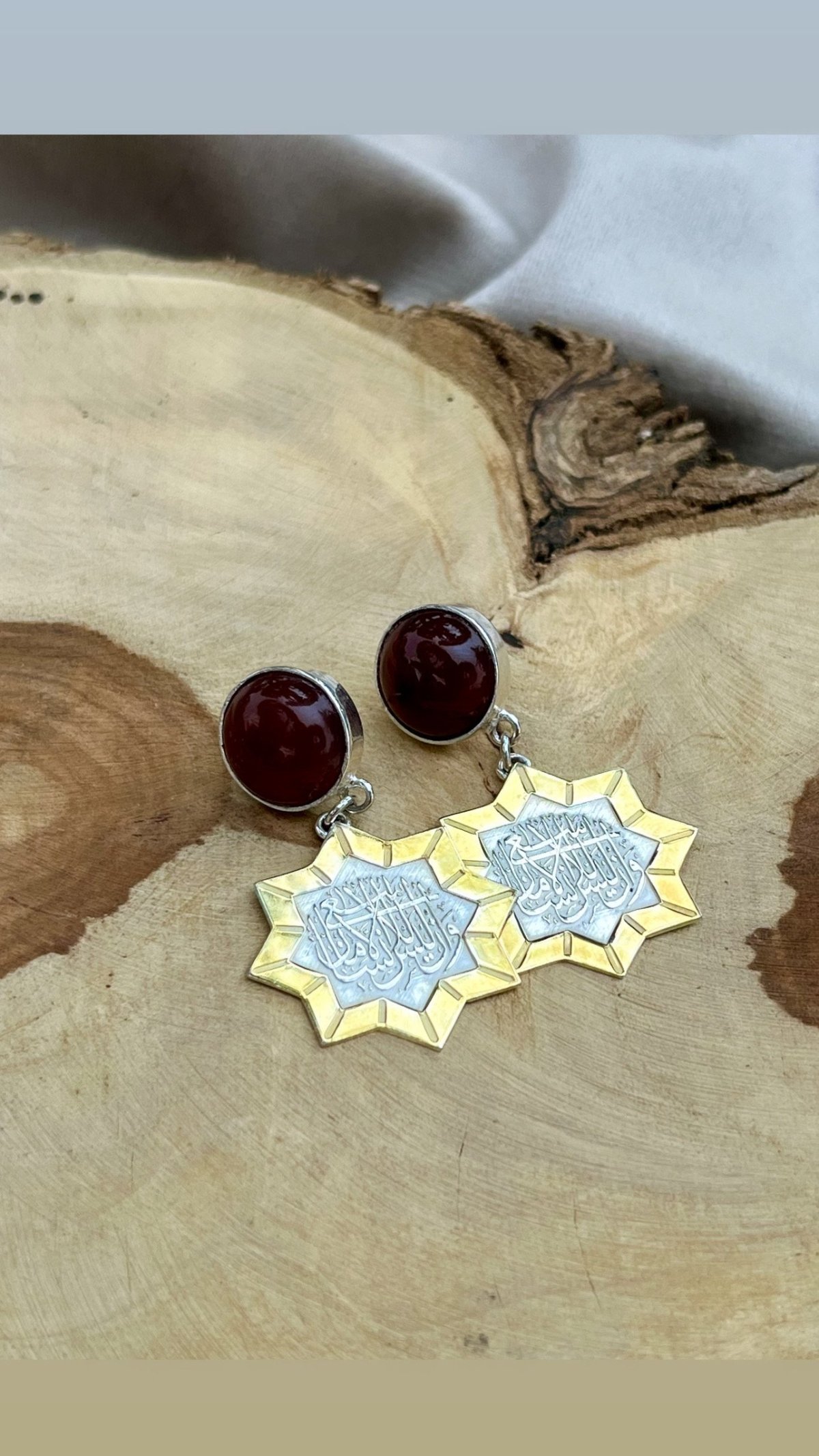 اكتشف الأناقة الخالدة مع هذه المجموعة الفضية المصنوعة يدويًا، والمزينة بأحجار العقيق الطبيعية، وكلمات عربية محفورة بشكل جميل، وقطعة مركزية ذهبية رائعة. مزيج من الفن التقليدي