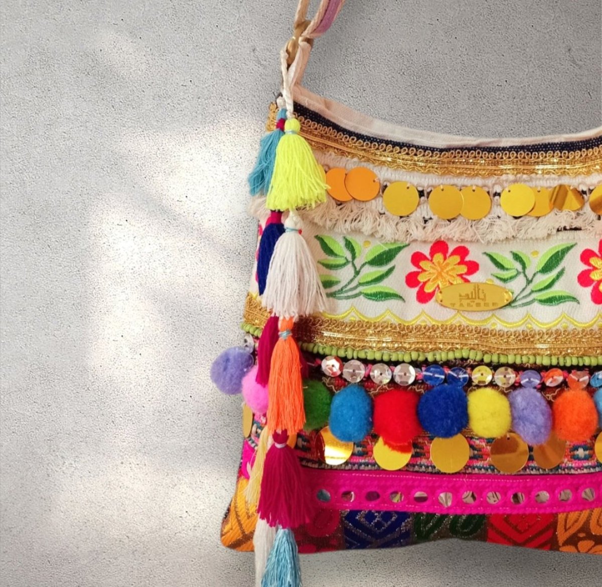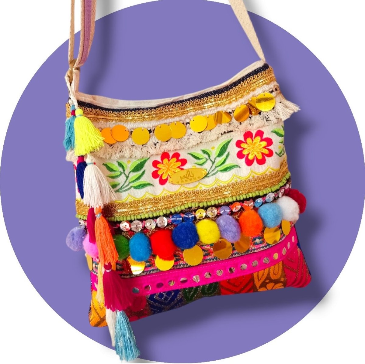 عمل فني بحس بوهيمي حر، كل قطعة فريدة تنبض بالألوان وتحكي حكاية خاصة من ابداع فنان مصري اصيل شنطة كروس مقاس 25*25 قماش هندي مجمع ومطرز يدوياً، الضهر دك جينز البطانة قماش دك تقيل 500 جم، قفل مغناطيس اليد كروس