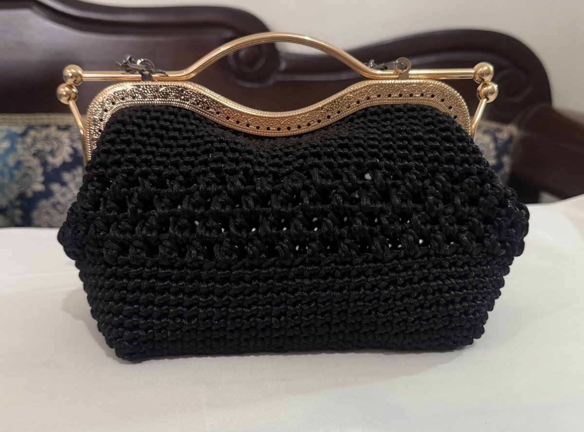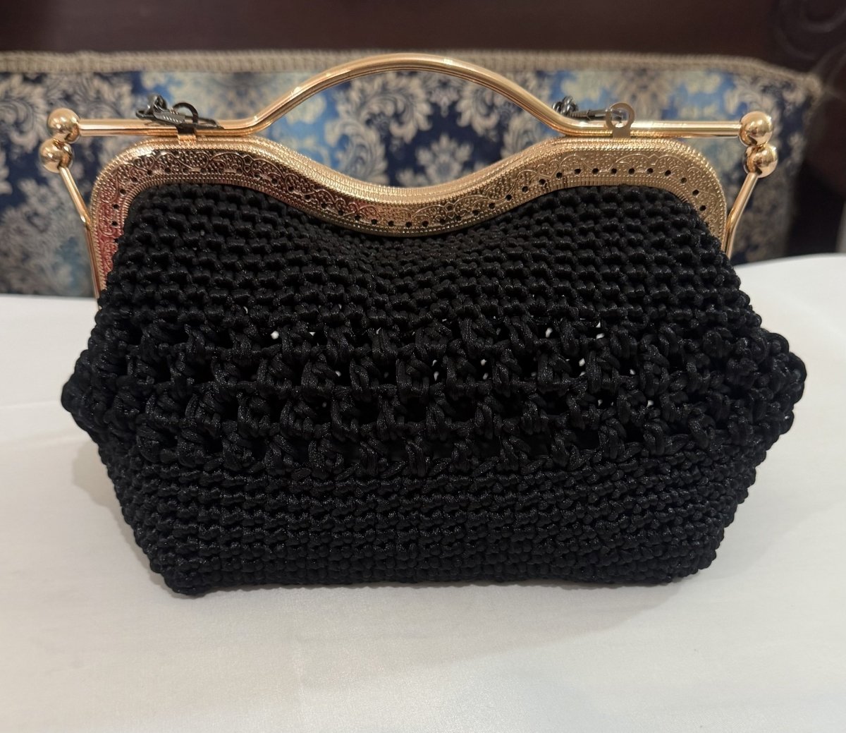 شنطة كروشية بخيط الستان المبروم بمظهره الرائع مع فريم ذهبى مميز و بطانه ستان من الداخل وحزام معدنى و موجود تقوية للقاعدة القاعده ١١سم و ١٨ سم عرض الشنطة ٢٤سم و الطول ١٢ سم