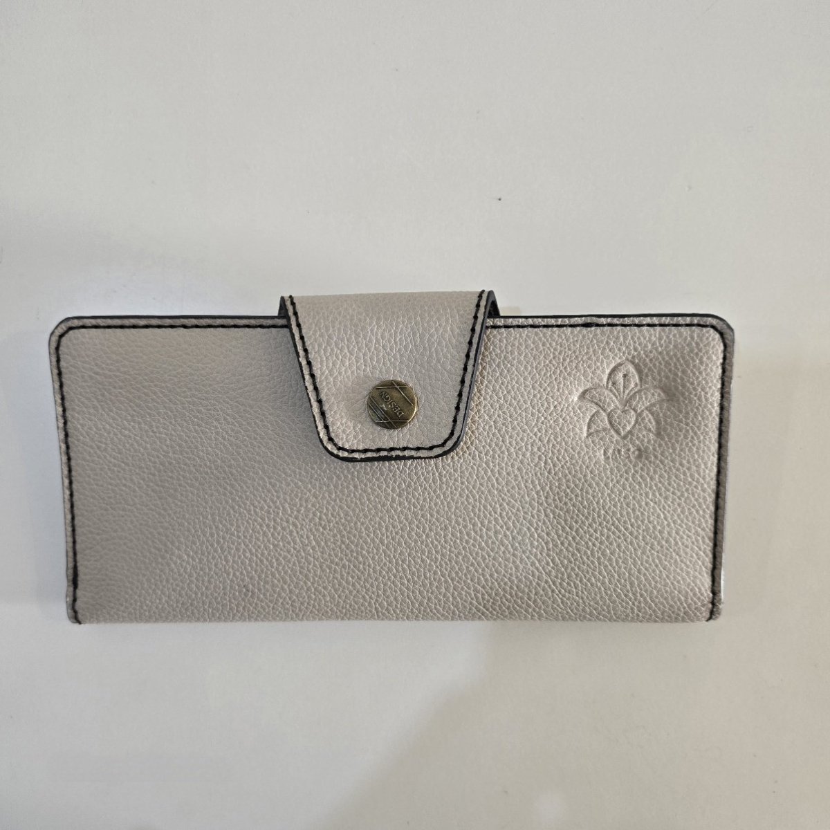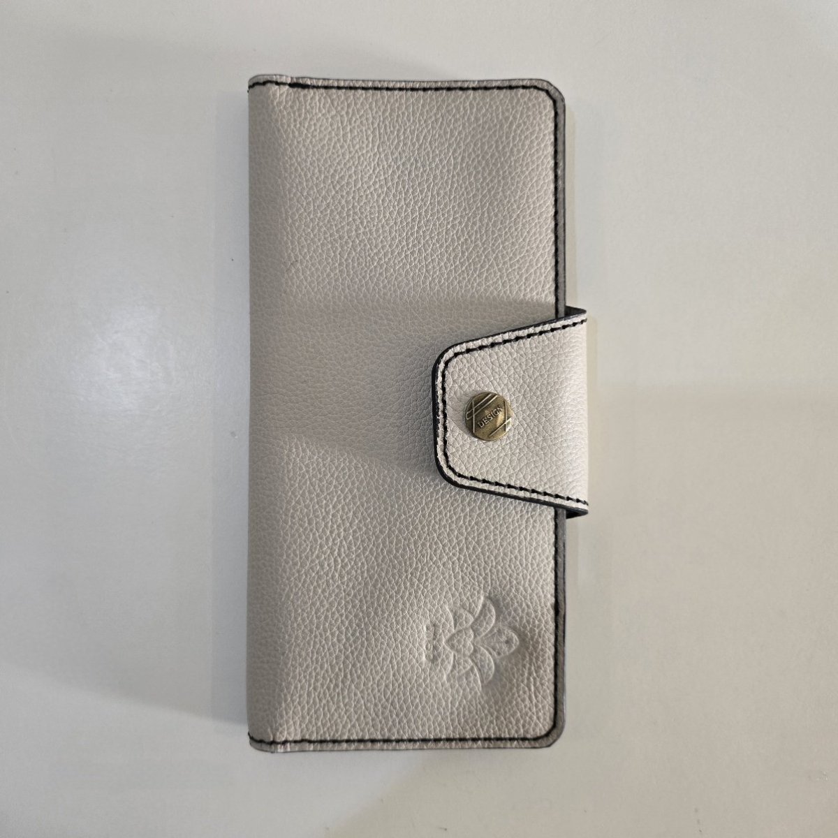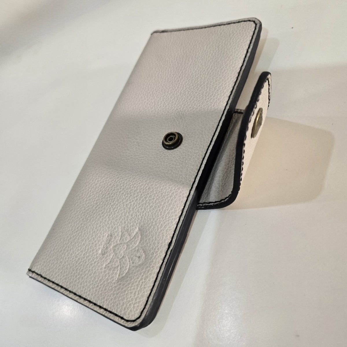 محفظة جلد طبيعي نسائية طويلة قابلة للطي مقاس 10* 22 سم لونها ابيض مائل للبيج بها 6 فتحات للكروت و 1 سوسته و 2 جيب اضافي وغطاء أمامي بكبسون نحاسي