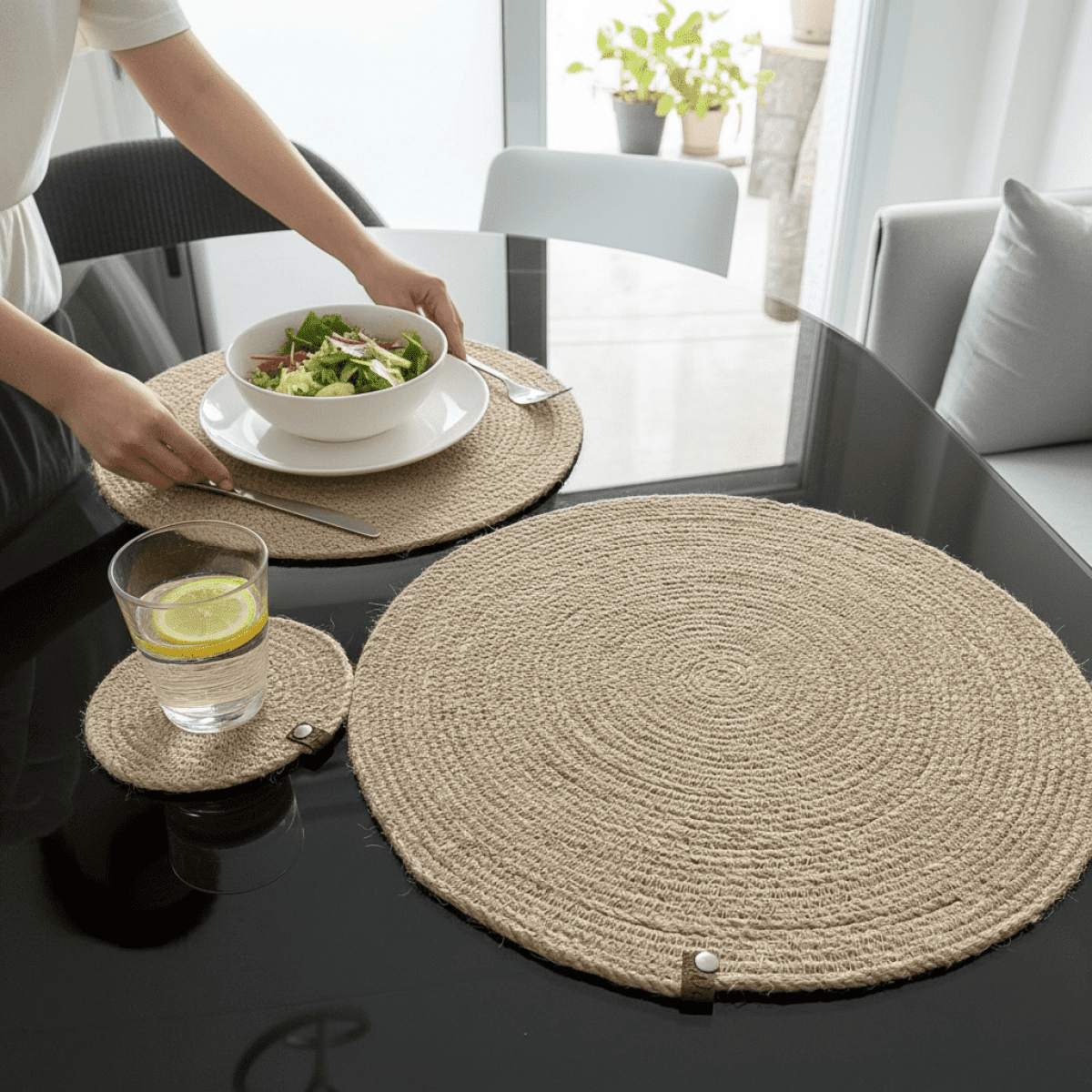 قاعدة تقديم للأطباق لحماية سطح الترابيزة من الحرارة والخدوش اليومية. المقاس: قطر 38 سم العناية: للبقع الخفيفة يُفضّل تنظيفها فورًا بقطعة مبلولة أو مناديل مبللة، ثم تجفيفها على سطح مستوي. عند الحاجة: غسيل يدوي خفيف بصابون وتجفيف على سطح مستوي.