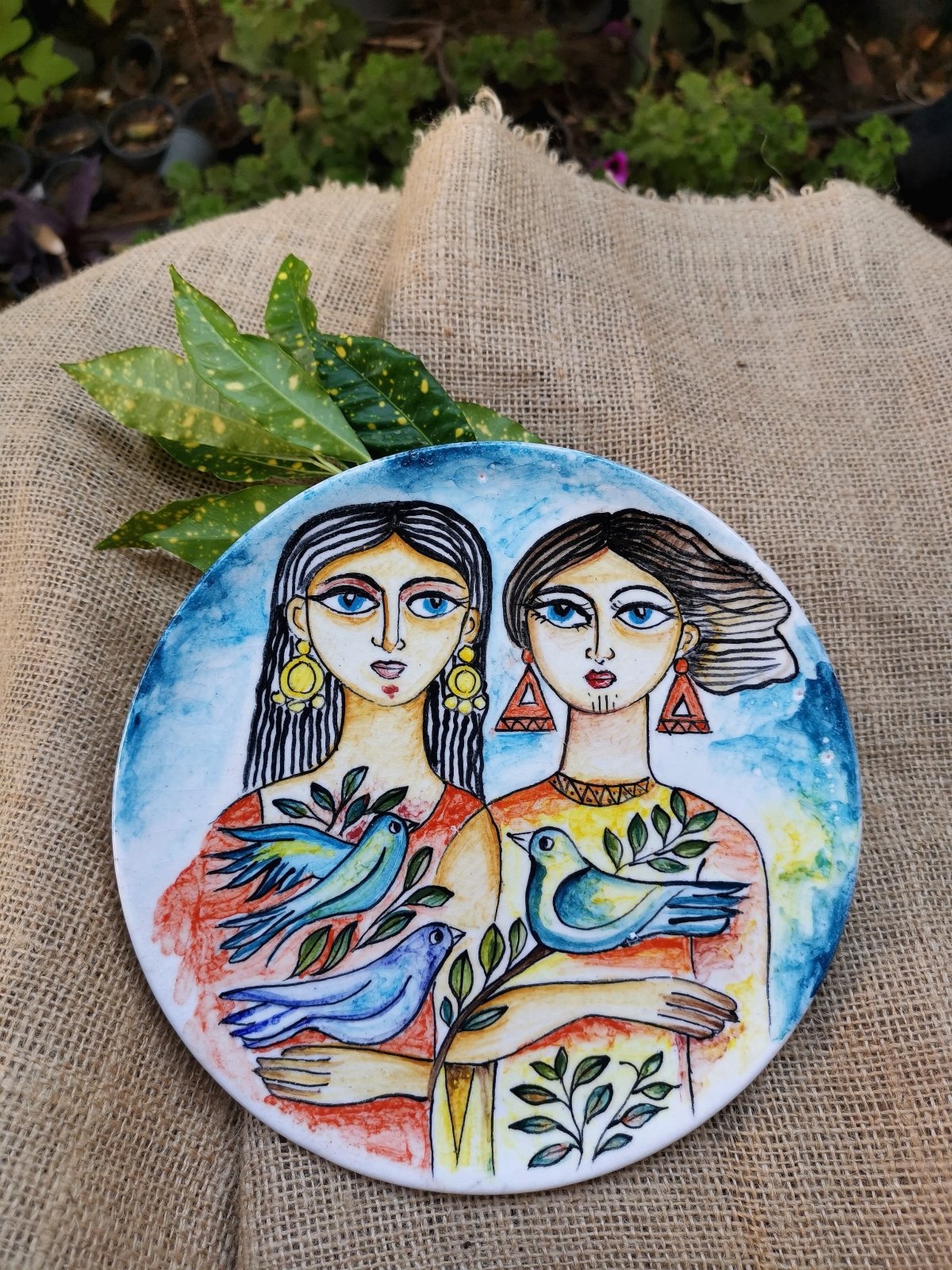 طبق خزفى دائرى قطر 20 سم تقريبا، مرسوم يدويا بزخارف مستوحاه من الفن الشعبى، يستخدم فى الديكور وصالح لتقديم الطعام والاستخدام فى المايكرويف