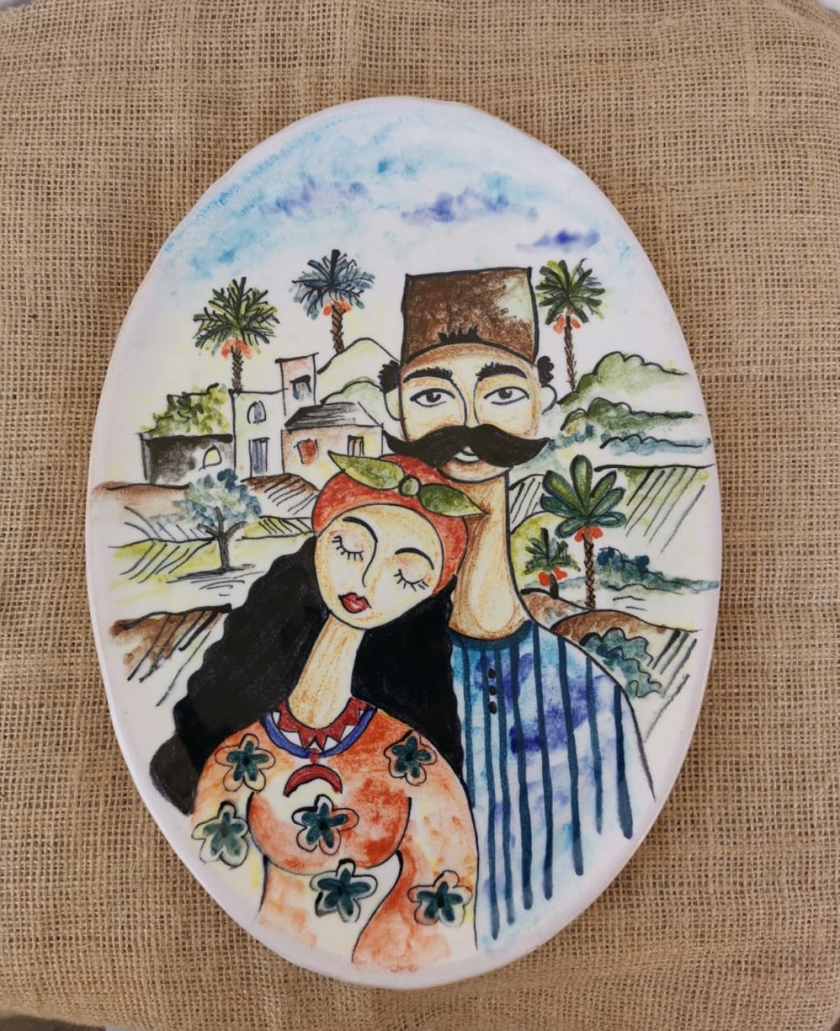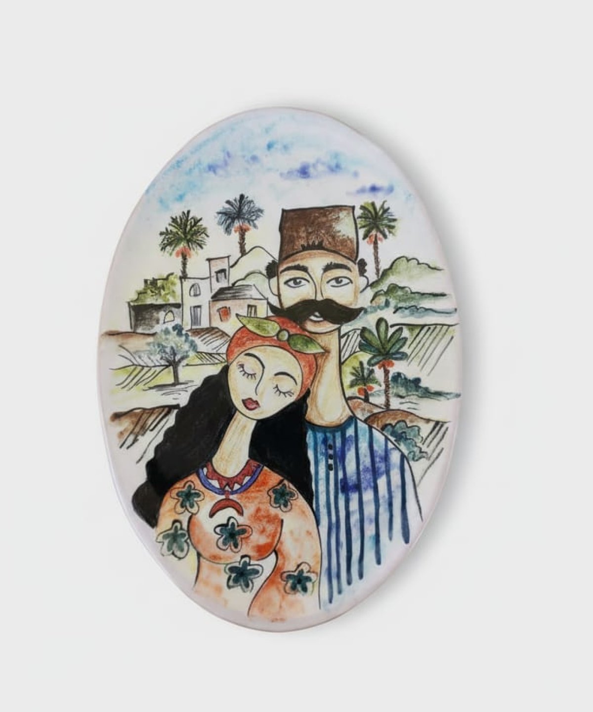طبق خزفى بيضاوى حجم كبير طول 35 سم تقريبا، مرسوم يدويا بزخارف مستوحاه من الفن الشعبى، يستخدم فى الديكور وصالح لتقديم الطعام والاستخدام فى المايكرويف