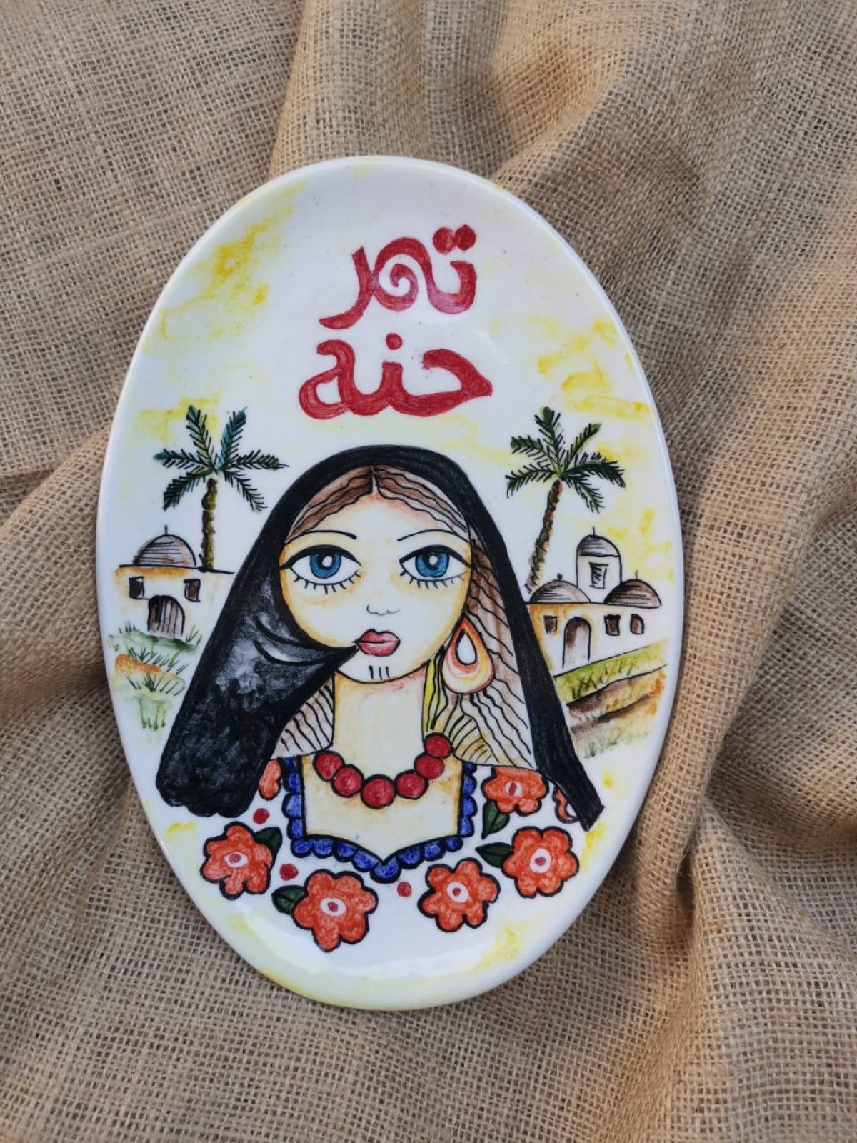 طبق خزفى بيضاوى طوله 30 سم تقريبا، مرسوم يدويا بزخارف مستوحاه من الفن الشعبى، يستخدم فى الديكور وصالح لتقديم الطعام والاستخدام فى المايكرويف
