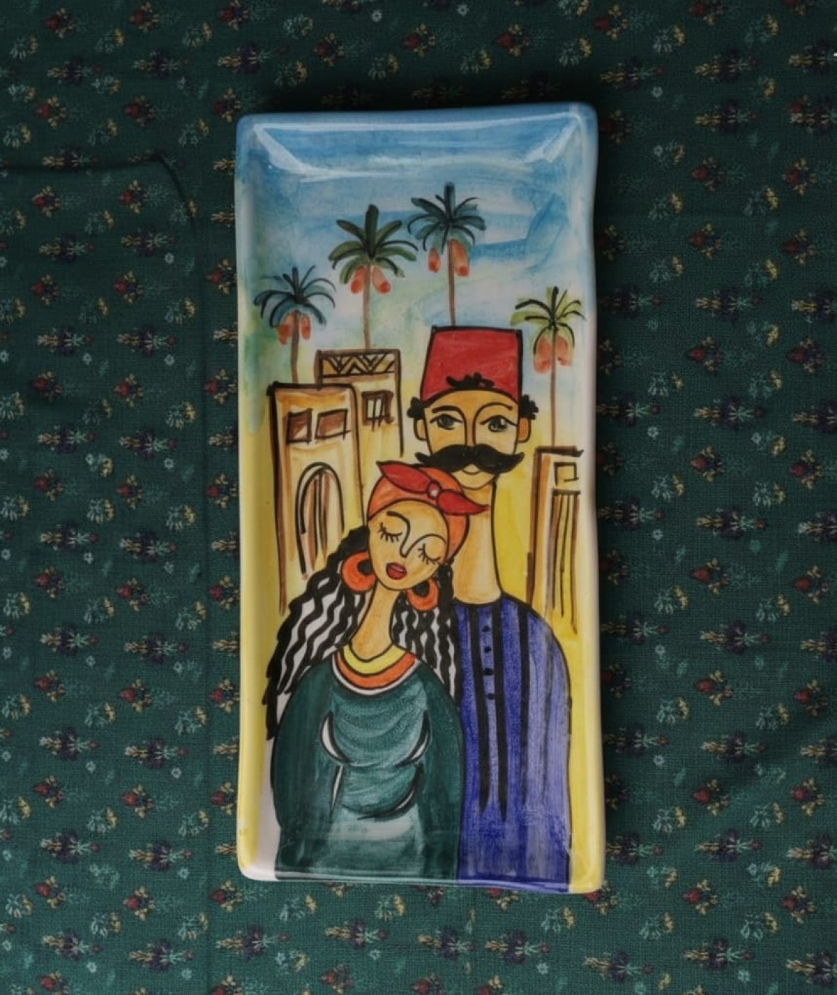 طبق خزفى مستطيل مقاس 15×30 سم تقريبا، مرسوم يدويا بزخارف مستوحاه من الفن الشعبى، يستخدم فى الديكور وصالح لتقديم الطعام والاستخدام فى المايكرويف
