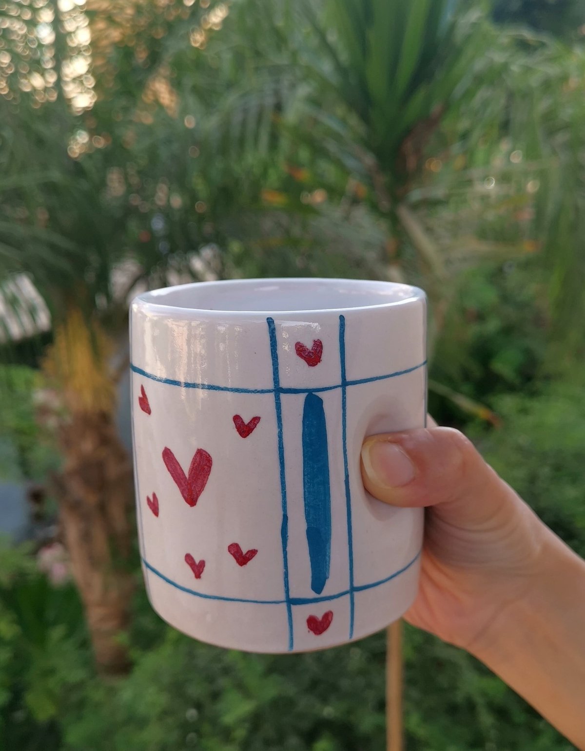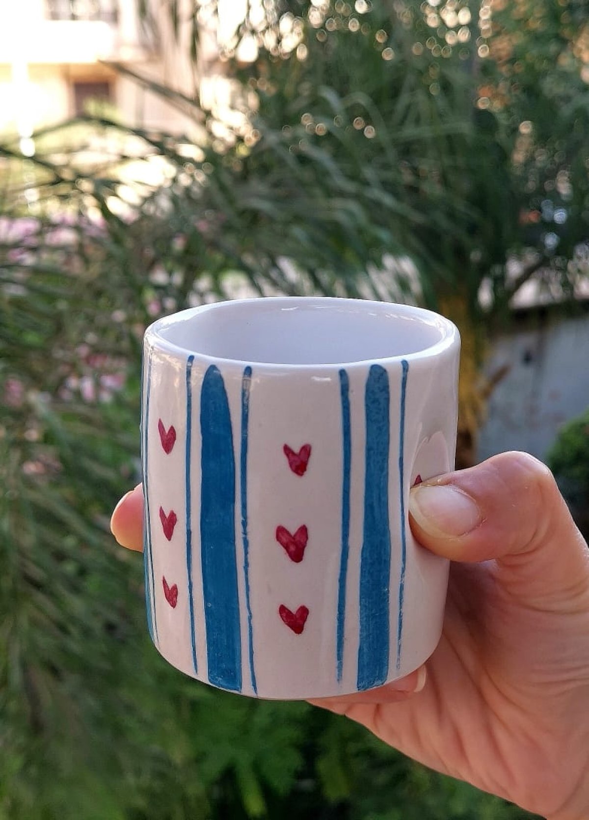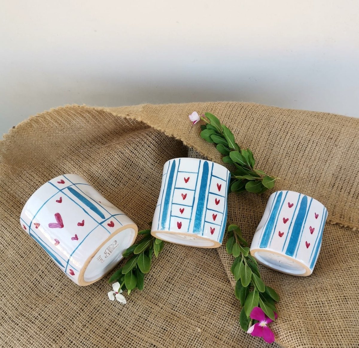طقم أكواب خزفية 3 قطع سعة 150، 250، 350 تقريبا ، مرسوما يدويا بزخارف خطية وأشكال للقلوب، صالح للاستخدام فى المايكرويف