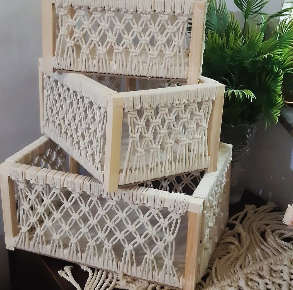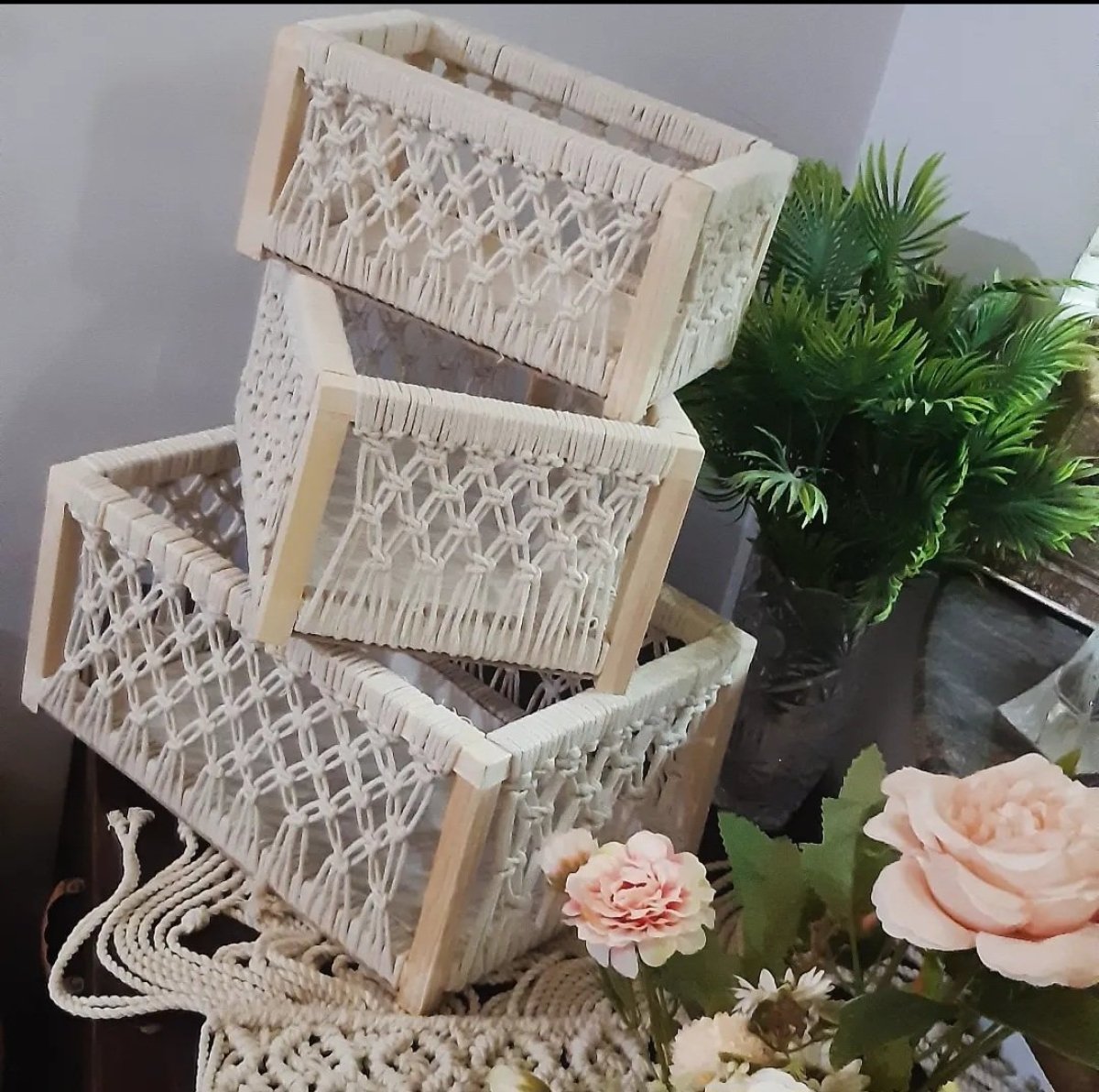 بوكس من الخشب و القاعدة خشب مع خيوط من المكرميه بمقاسات مختلفه