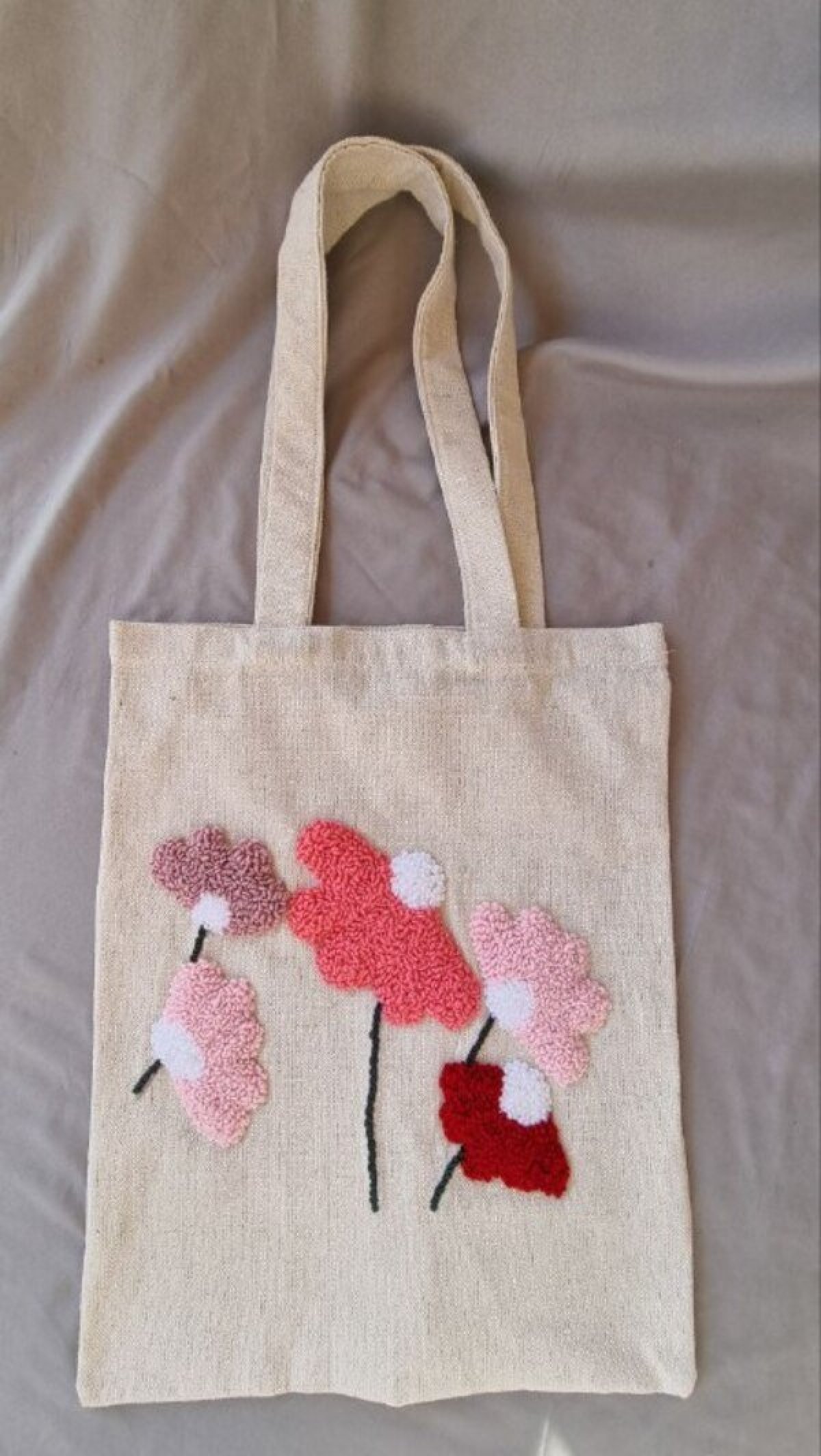 شنطة قماش بانش نيدل هاند ميد ✨ تصميم ورد رقيق يضيف لمسة أنوثة لأي لوك 🌸 خفيفة، عملية، ومناسبة لكل يوم