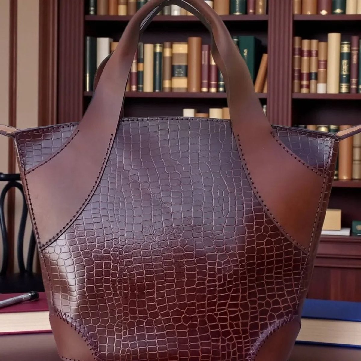 شنطه حريمى جلد طبيعى هاندميد جلد بقرى مطبوع طبعه لازار وجلد بنى ساده أبعاد ٤٠×٣ سم جيب داخلى خياطه يدوى متاح تنفيذ الوان