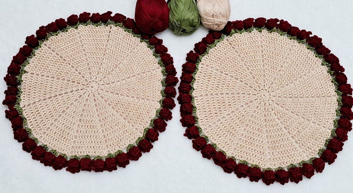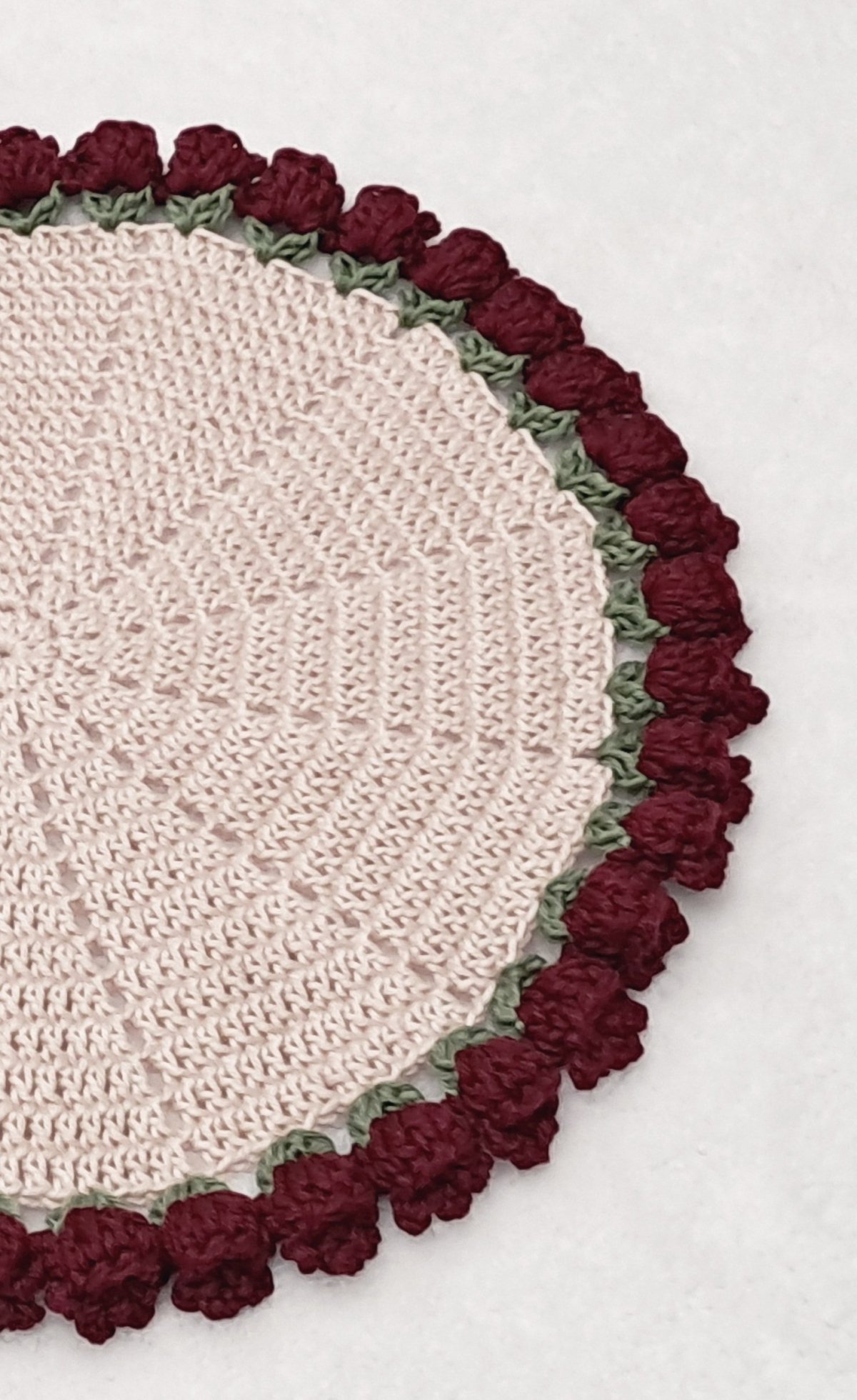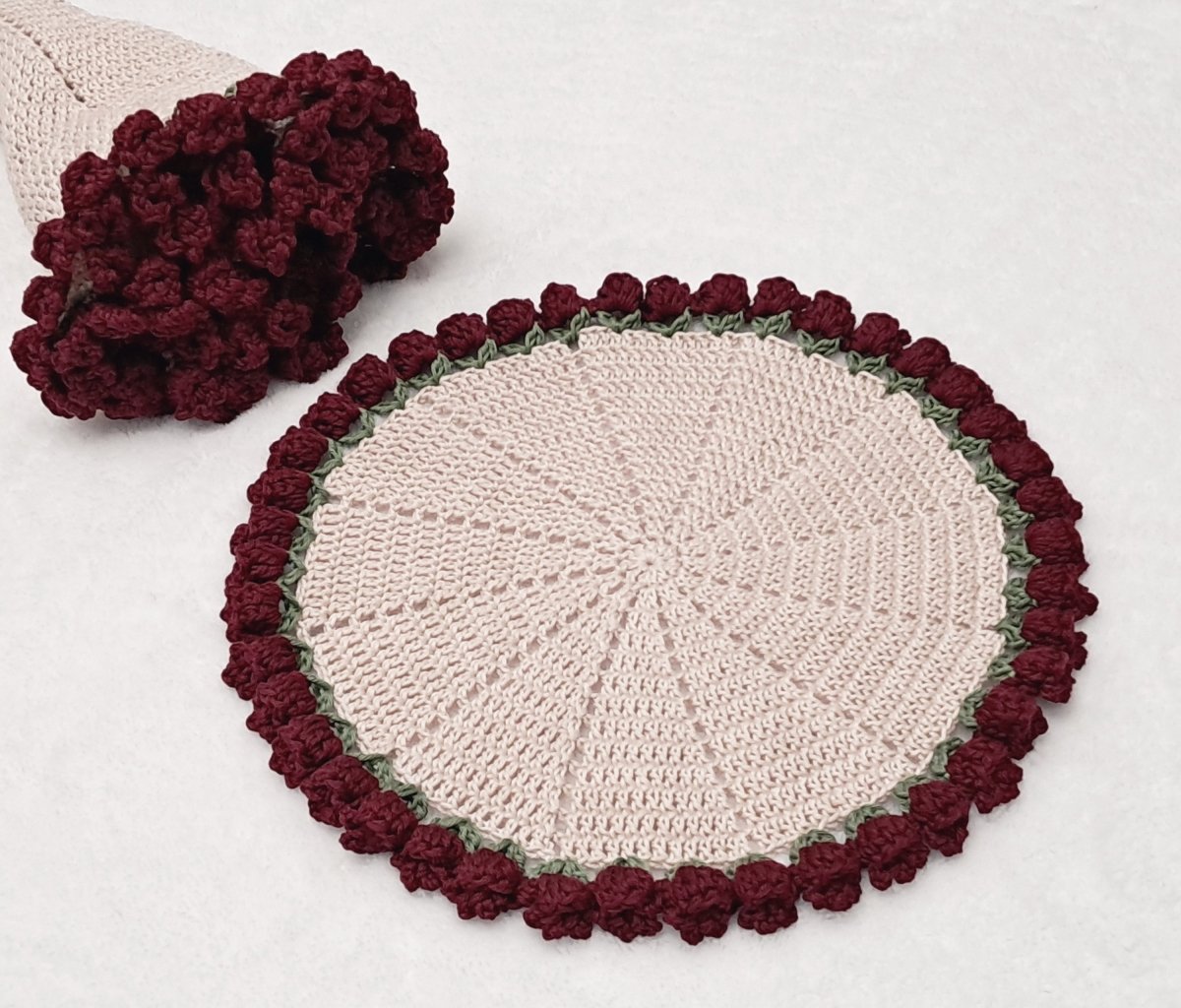 مفرش كروشية بورد التيوليب مشغول بخيط قطن ١٠٠% جودة ممتازة وثبات في اللون . قطر المفرش ٣٠ سم . ممكن استخدامة كمفرش أو كوستر لترابيزة سفرة .متاح تنفيذة بأى مقاس مطلوب وبأى الوان للمفرش أو الورد .