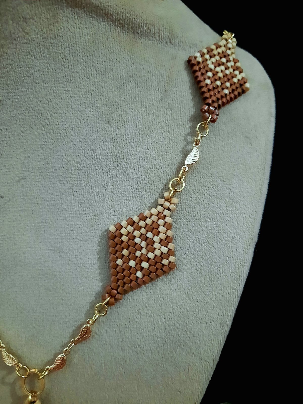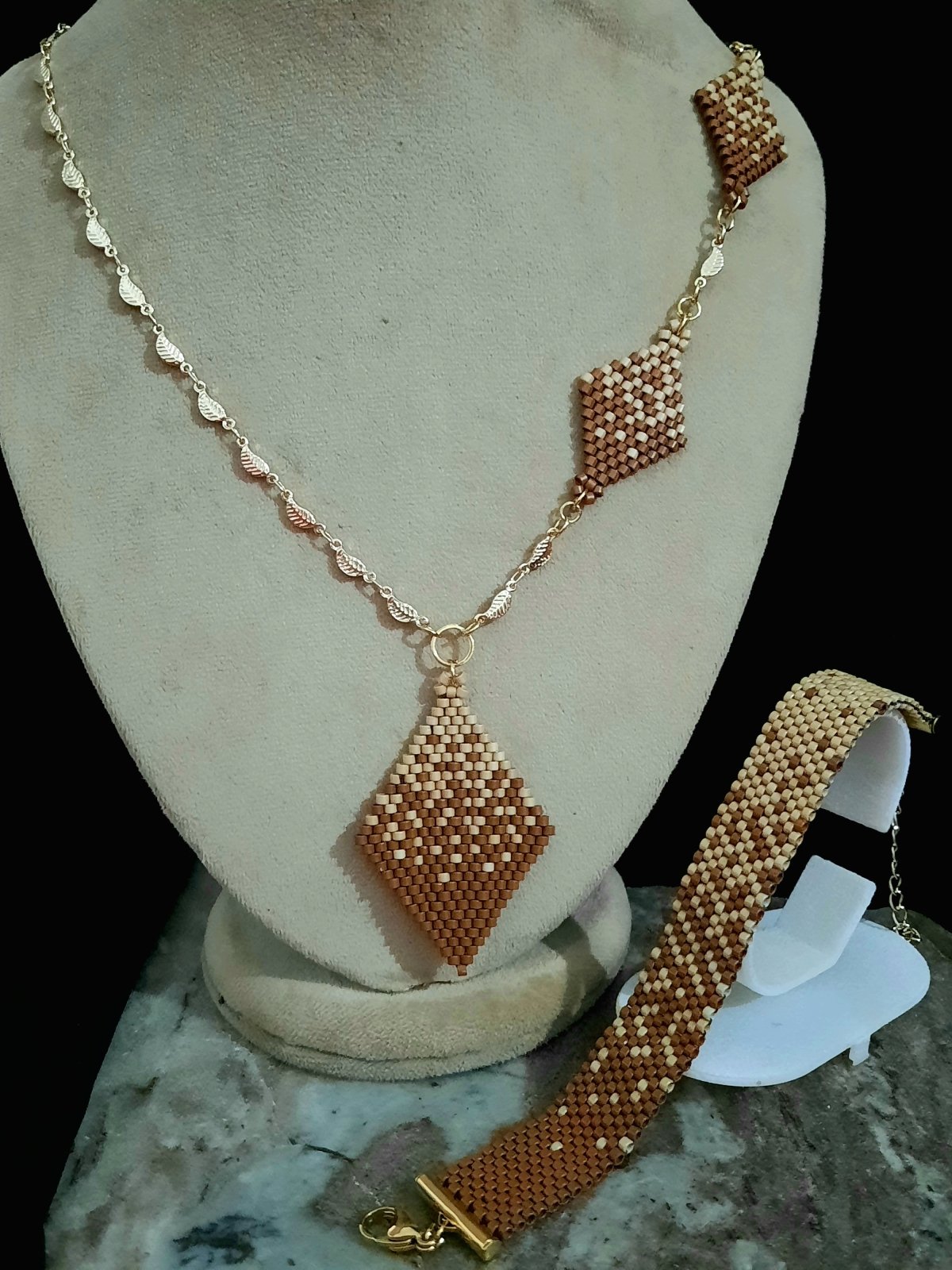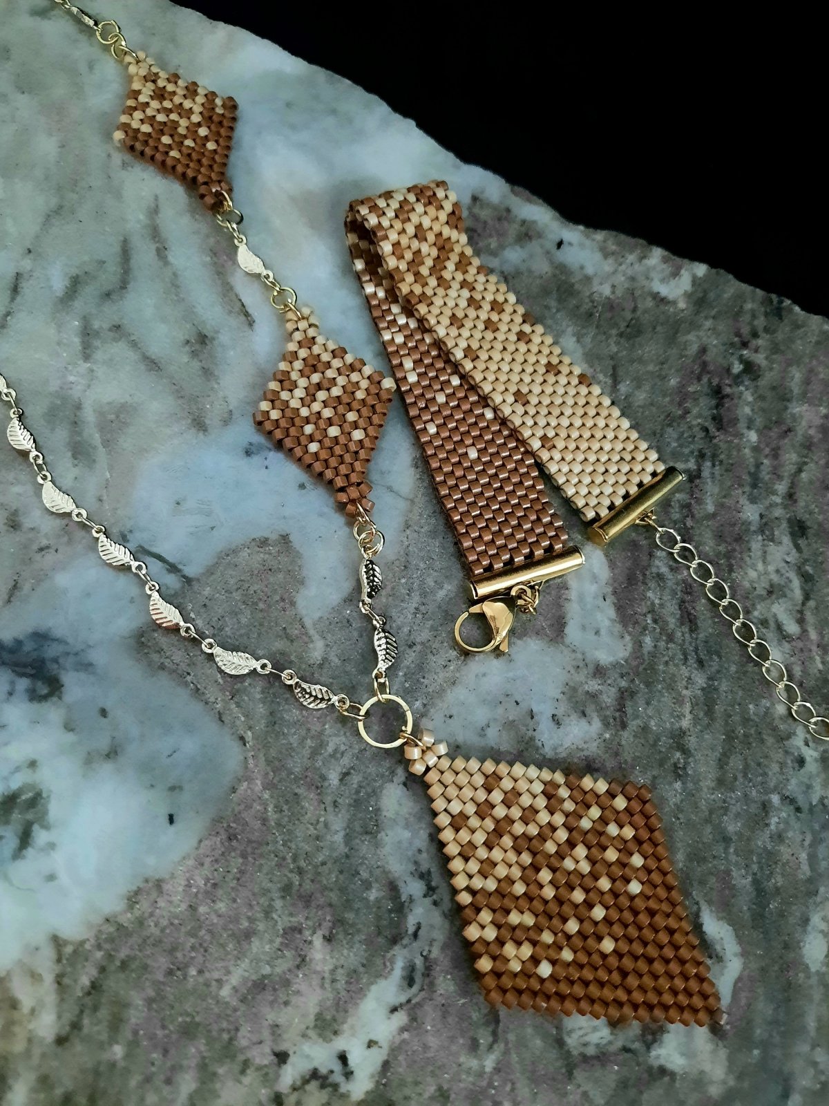 طقم رقيق يمثل تداخل لونى الكافيه والكراميل ... المجموعة عبارة عن كوليه ٦٠ سم مع إمكانية تطويله و المكون من ٣ وحدات بأحجام مختلفة تمثل التداخل بين لونى الكافيه والكراميل بشكل انسيابى ورقيق وايضا اسورة من نفس التصميم... مصنوع بالكامل من خرز الميوكى اليابانى (2.2mm) الغير لامع .. المواد المعدنية المستخدمة غير قابلة للصدأ او تغيير اللون ولا تسبب التحسس