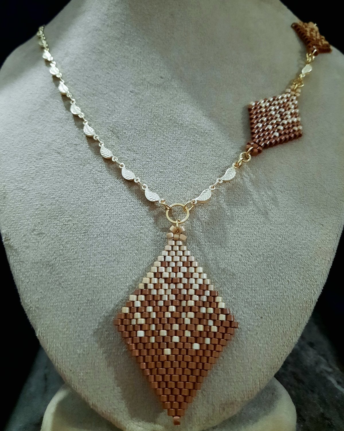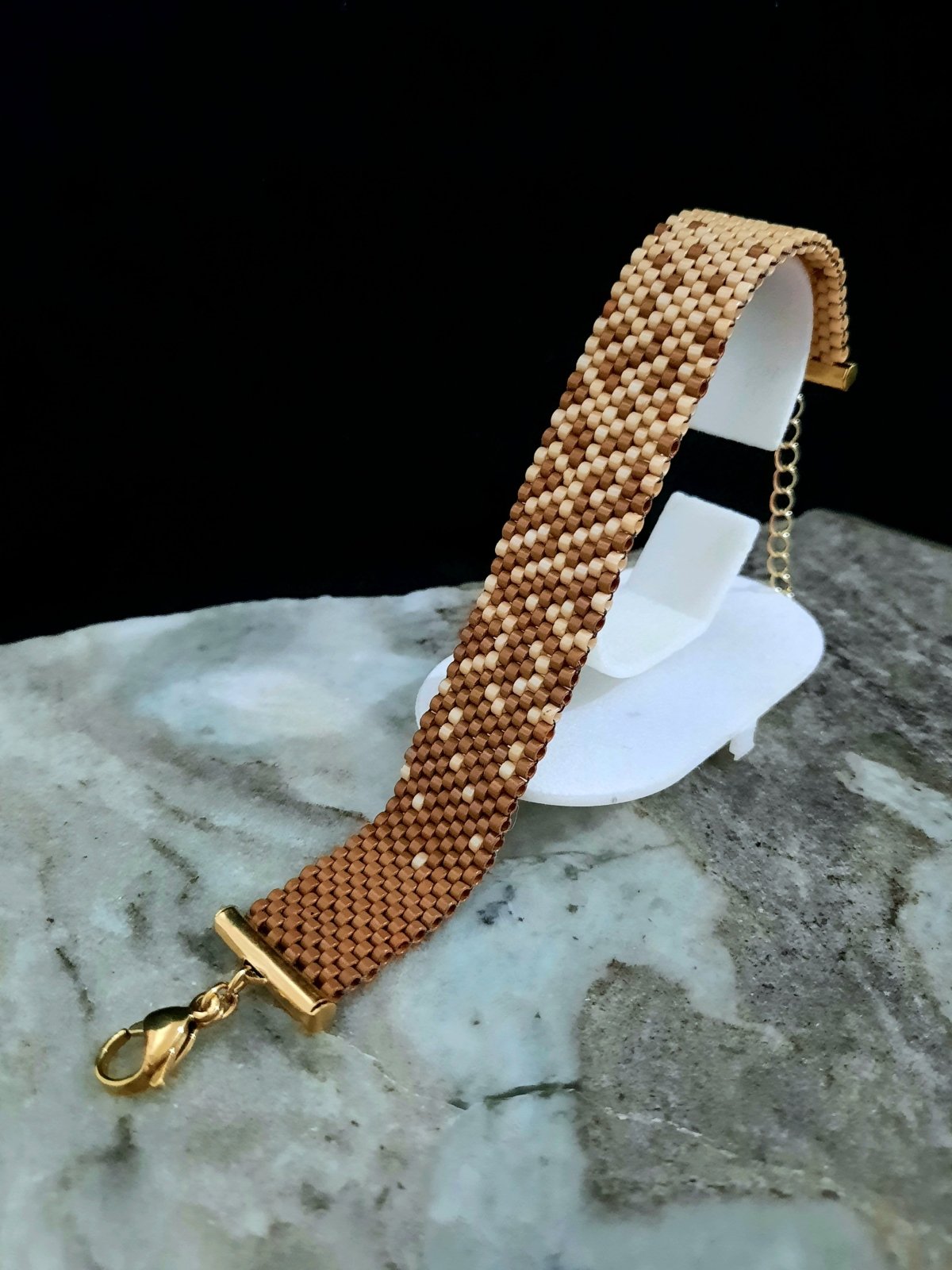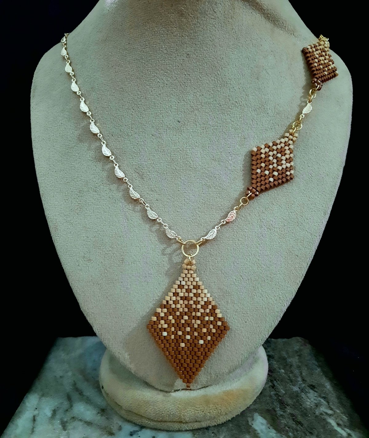 طقم رقيق يمثل تداخل لونى الكافيه والكراميل ... المجموعة عبارة عن كوليه ٦٠ سم مع إمكانية تطويله و المكون من ٣ وحدات بأحجام مختلفة تمثل التداخل بين لونى الكافيه والكراميل بشكل انسيابى ورقيق وايضا اسورة من نفس التصميم... مصنوع بالكامل من خرز الميوكى اليابانى (2.2mm) الغير لامع .. المواد المعدنية المستخدمة غير قابلة للصدأ او تغيير اللون ولا تسبب التحسس