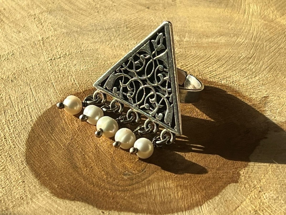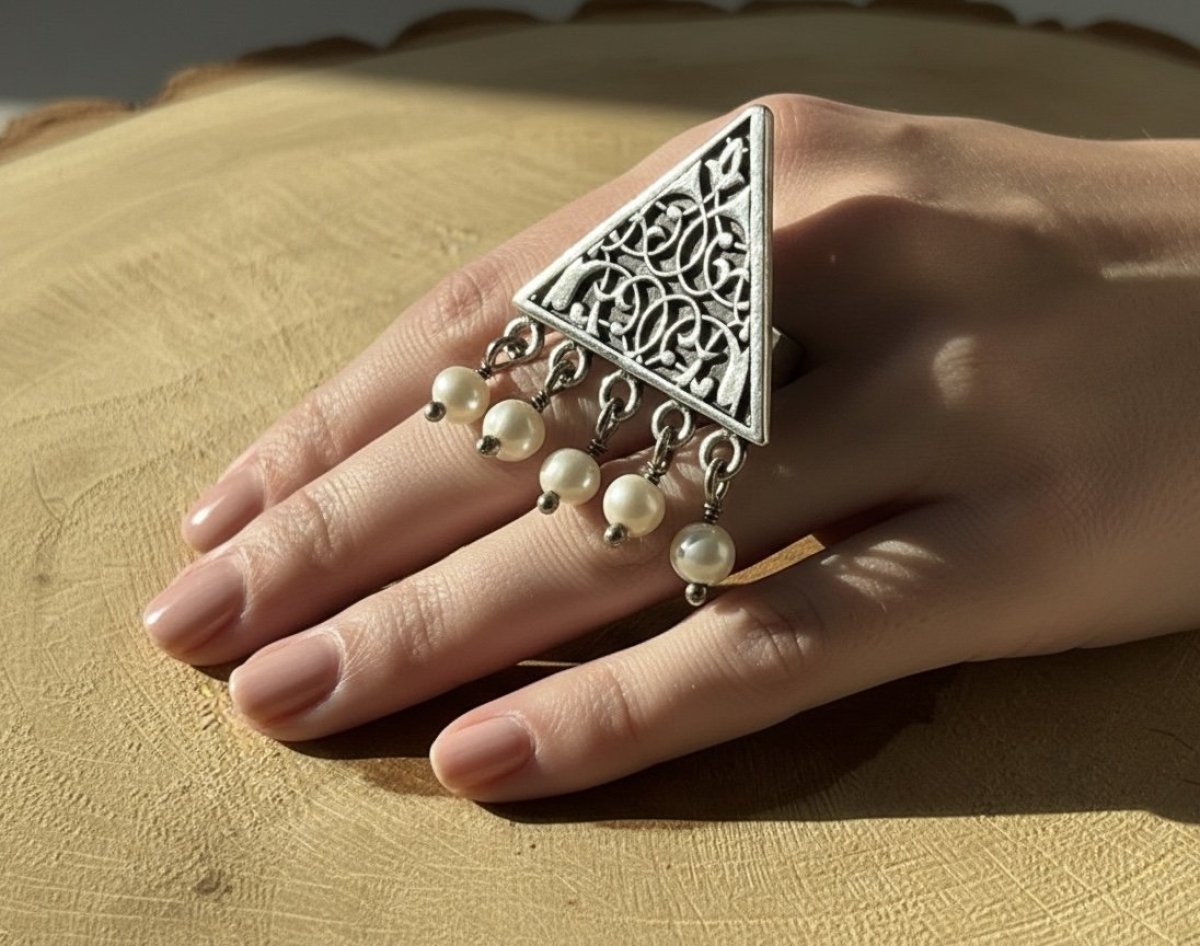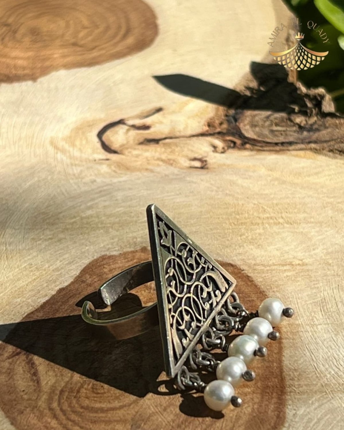 ✨ خاتم بتفاصيل إسلامية راقية، مزين باللؤلؤ الجميل على شكل مثلث… قطعة فريدة بجمالها وسحرها الخاص ✨ A ring with elegant Islamic details, adorned with delicate pearls in a triangular design… a truly unique piece of beauty.