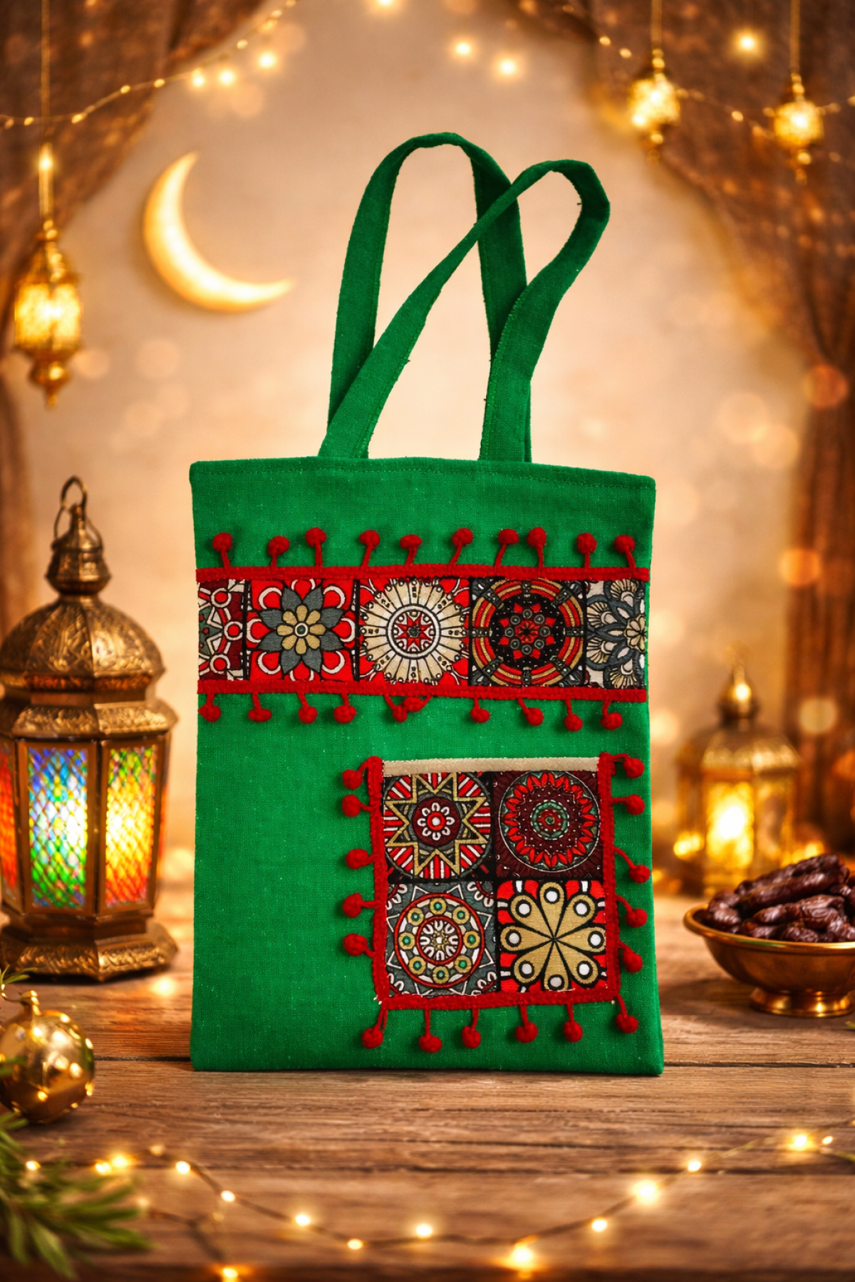 شنطة قماش فاخرة مصنوعة يدويًا من قماش الدك، بتفاصيل تطريز مميزة مستوحاة من الفن والتراث الرمضاني. أنيقة، عملية، ومتعددة الاستخدامات مثالية للاستخدام اليومي، أجواء رمضان، وكهدية للأصحاب. المقاس: 40 سم عرض * 45 سم طول طول اليد: 60 سم بها جيب خارجي صغير