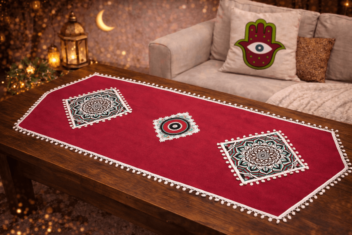 مفرش سفرة فاخر من قماش الدك بتصميمات رمضانية أنيقة مستوحاة من أجواء الشهر الكريم. يضيف لمسة دفء ورُقي لسفرة الإفطار والسحور، ويحوّل كل تجمع إلى تجربة رمضانية مميزة.