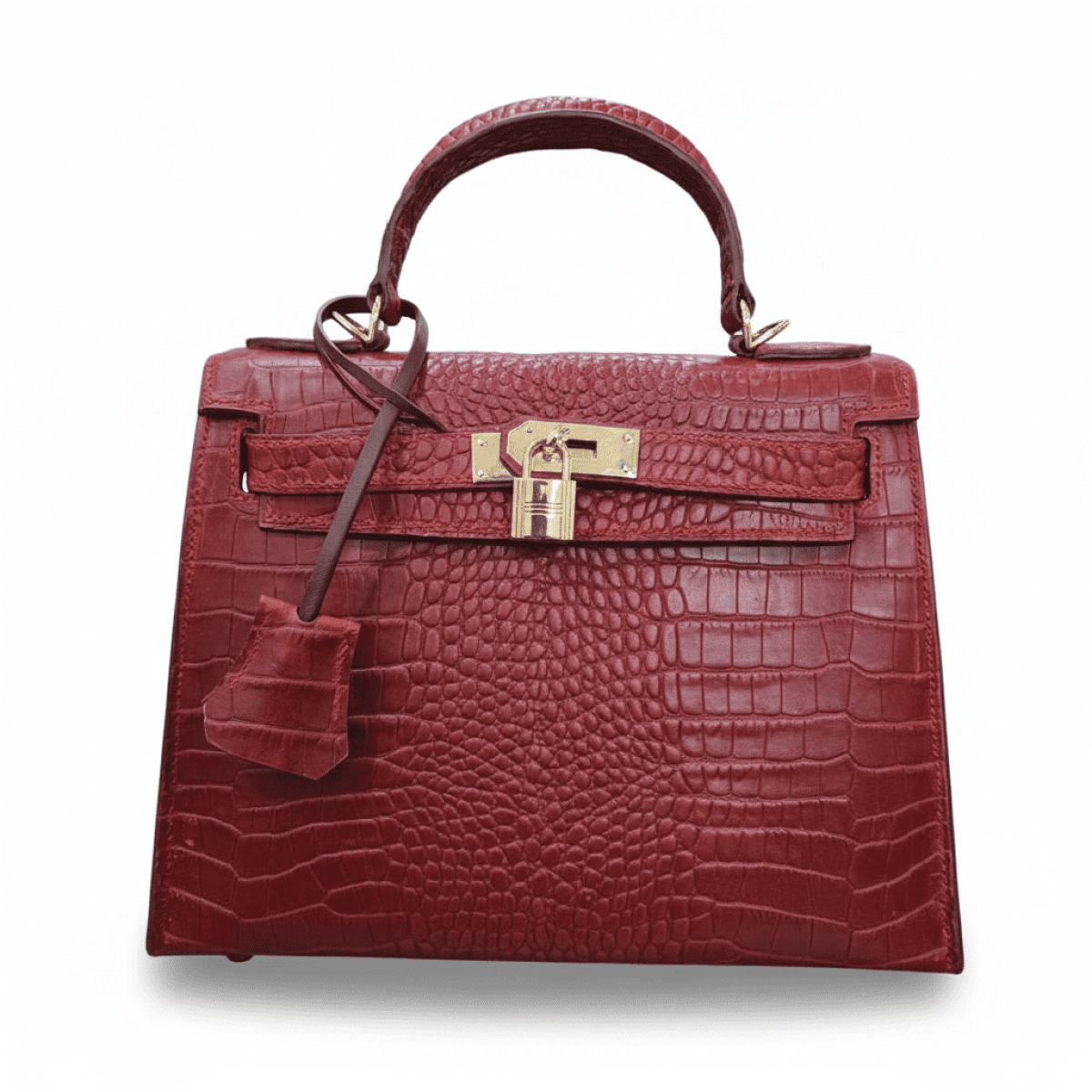 حقيبة يد حمراء انيقه على طراز كيلي للسيدات مصنوعة يدويًا بالكامل من الجلد الطبيعي بنقشة التمساح