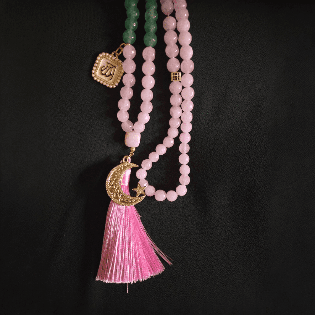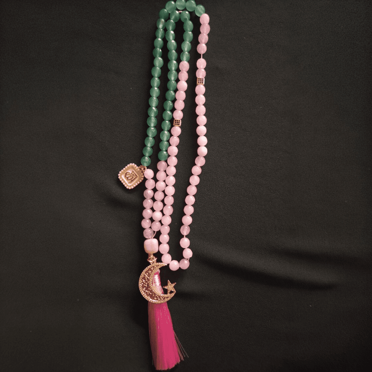 سبحة من حجر العقيق الطبيعي مقاس ٨(٩٩ حبة) بلونين الأخضر والوردي، تتميز بفواصل ودلايتين (لفظ الجلالة وهلال) من الذهب الصيني المقاوم لتغير اللون، مع شرابة حريرية وردية
