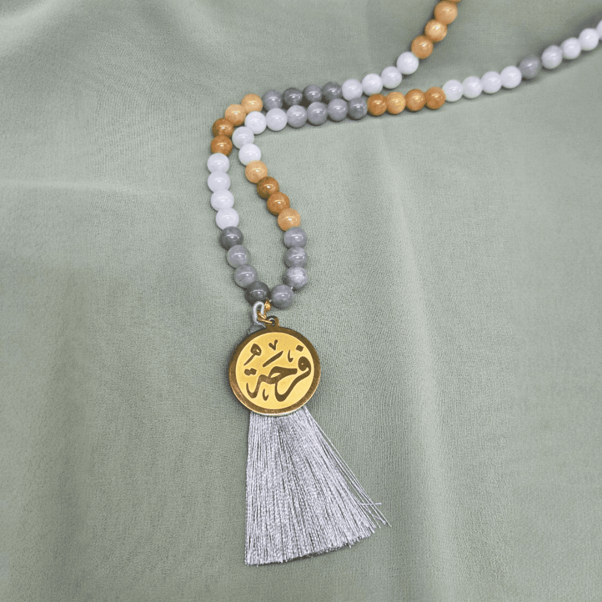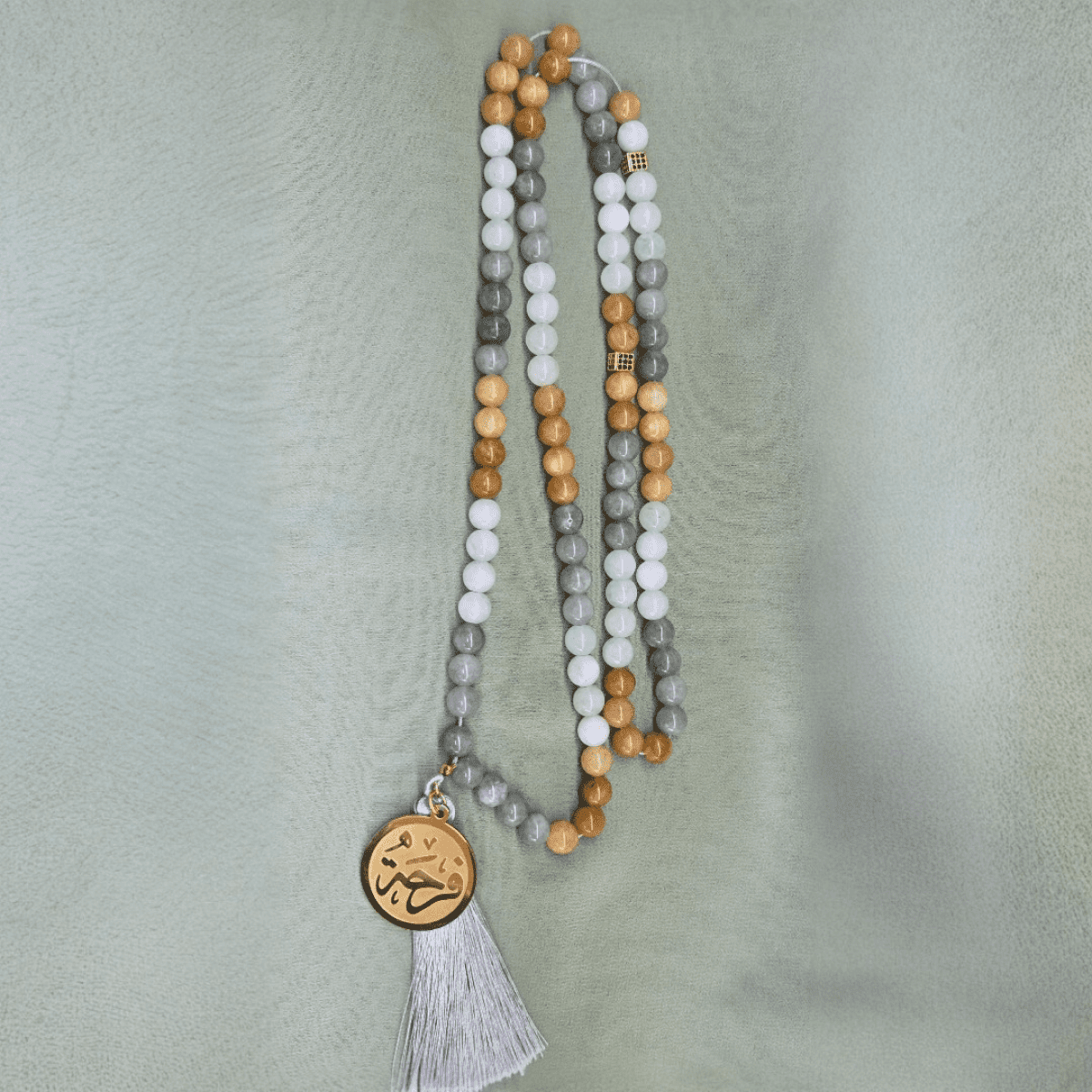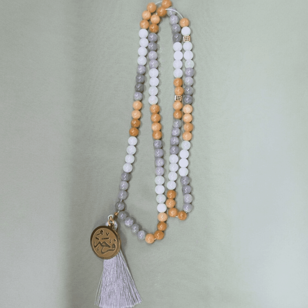 سبحة 99 حبة مصنوعة من حجر مكس فانتورين مقاس 8 مم بألوانه الطبيعية المتدرجة، مزودة بفواصل من الذهب الصيني ودلاية دائرية من الاستانلس ستيل المطلي بالذهب مع شرابة حريرية رمادية، ويمكن ارتداؤها كعقد طويل