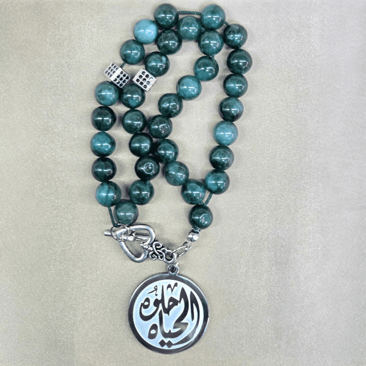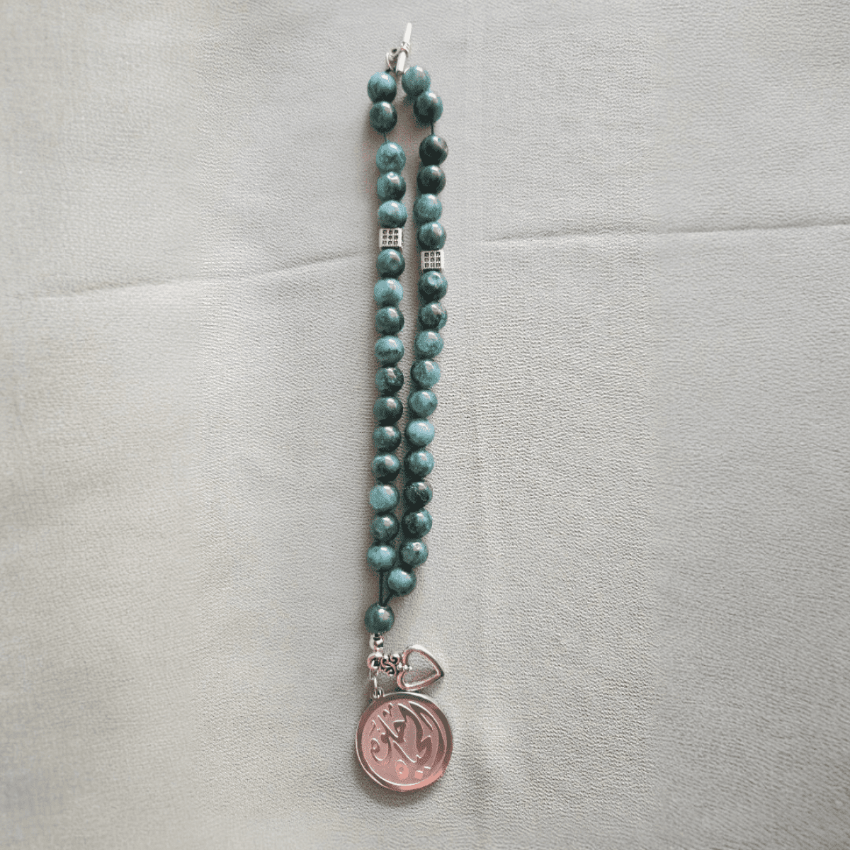 سبحة من حجر عقيق موسى الطبيعي (٣٣ حبة) مقاس 8 مم، تتميز بفواصل من الذهب الصيني فضي اللون ودلاية من الاستانلس ستيل المطلي بالفضة، مزودة بقفل معدني لتسهيل ارتدائها كإسورة يد