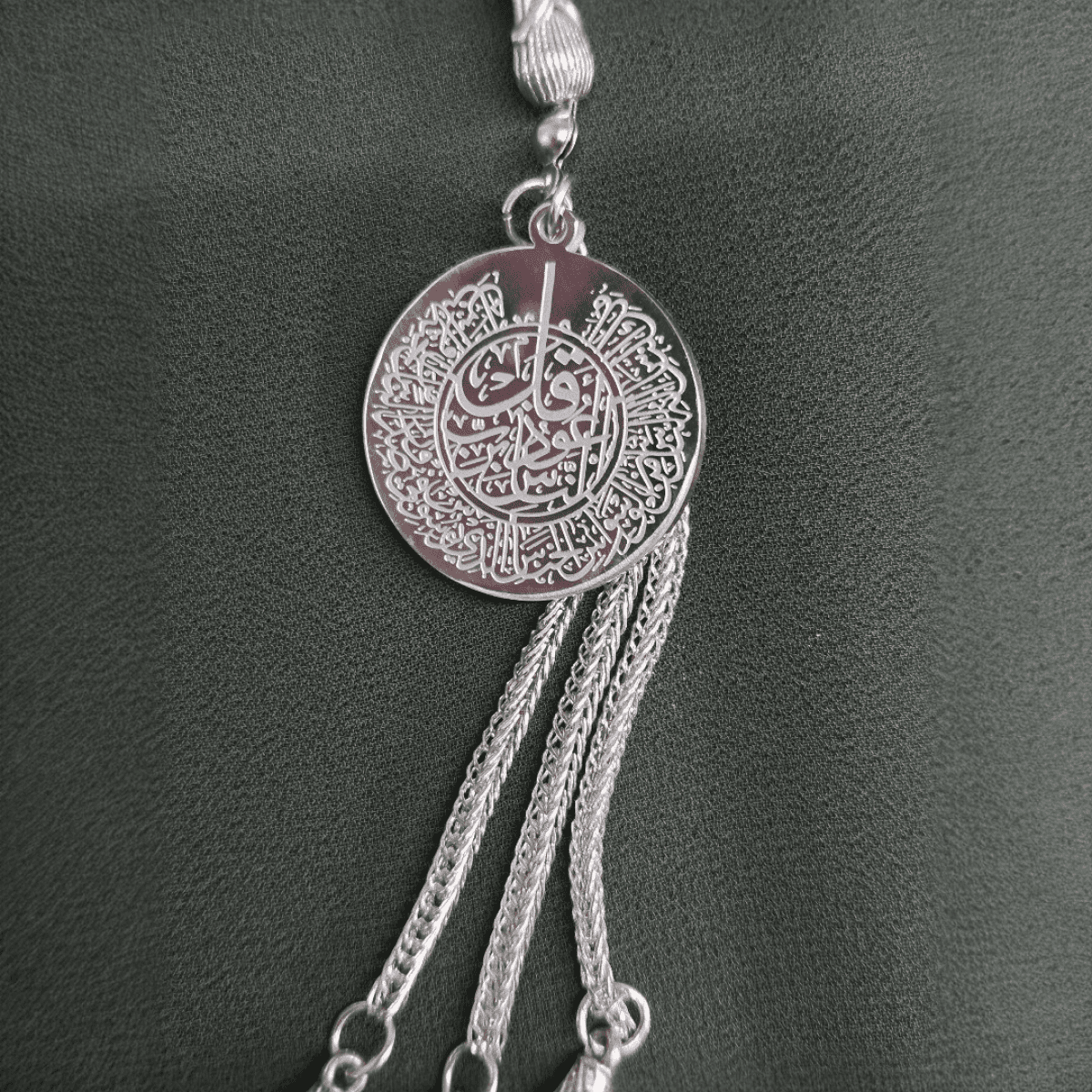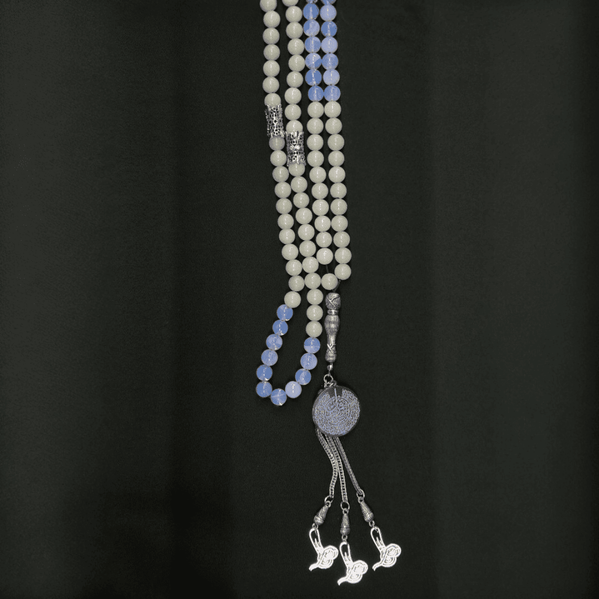 سبحة 99 حبة مصنوعة من حجر الطاقة، تتميز بفواصل مرصعة بالزركون ودلاية من الاستانلس ستيل المطلي بالفضة، مع شرابة معدنية مطلية بالفضة تضفي طابعاً عصرياً