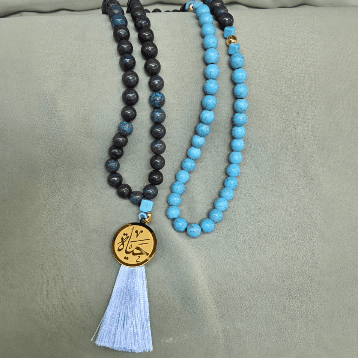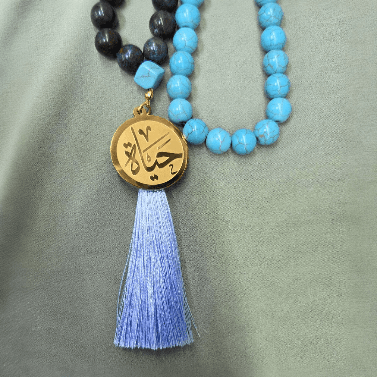 سبحة 99 حبة من حجر الفيروز الأفريقي الطبيعي مقاس 10 مم، تتميز بفواصل من حجر الهيماتيت الذهبي ودلاية من الاستانلس ستيل المطلي بالذهب، مع شرابة من الحرير الناعم
