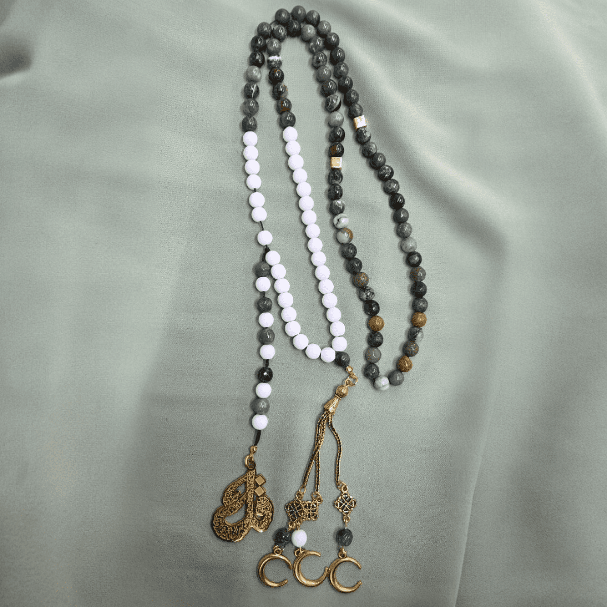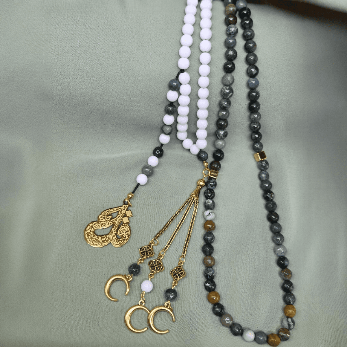 سبحة 99 حبة تجمع بين حجر العقيق الطبيعي وعقيق موسى، مزودة بـ "عداد" وفواصل من الهيماتيت الذهبي. تتضمن دلاية من الاستانلس ستيل وشرابة معدنية مطليين بالذهب، ويمكن ارتداؤها كعقد