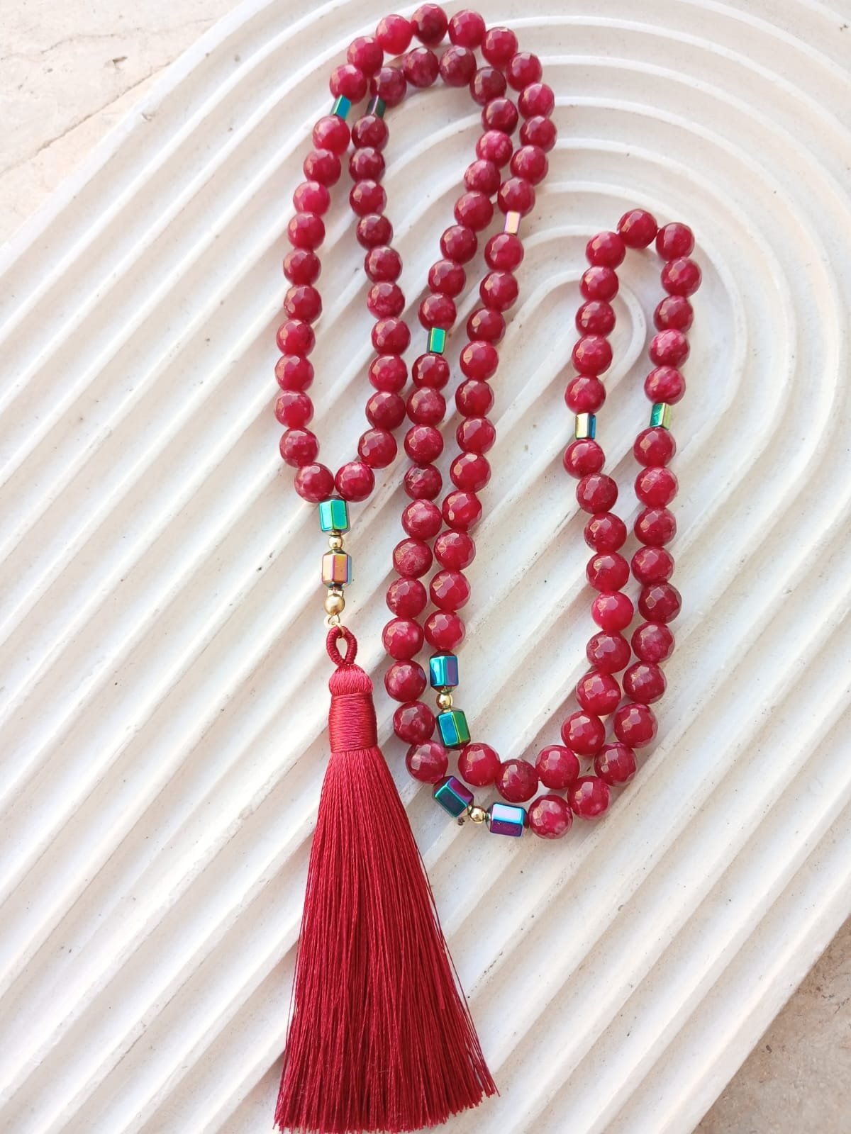 سبحة سكينة الياقوت القرمزية سبحة يدوية فاخرة (99 حبة) من أحجار العقيق الأحمر الزاهية، تتزين بفواصل معدنية من الهيماتيت وشرابة حريرية فاخرة. تصميم يجمع بين القوة والسكينة، صُنعت يدوياً بعناية فائقة لتكون قطعة فريدة تعبر عن