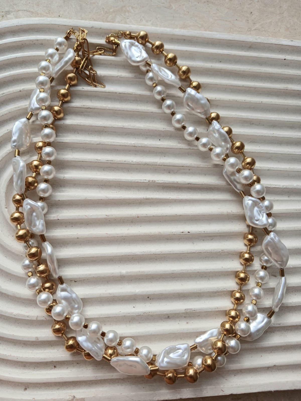 حفة فنية متعددة الطبقات مشغولة يدوياً من لؤلؤ مايوركا الفاخر وسلسلة من الستانلس ستيل عالي الجودة والمقاوم للصدأ. يجمع التصميم بين سحر اللؤلؤ الكلاسيكي وعصرية التفاصيل الذهبية، ليكون قطعة فريدة تمنحكِ إطلالة ملكية في أرقى مناسباتك.