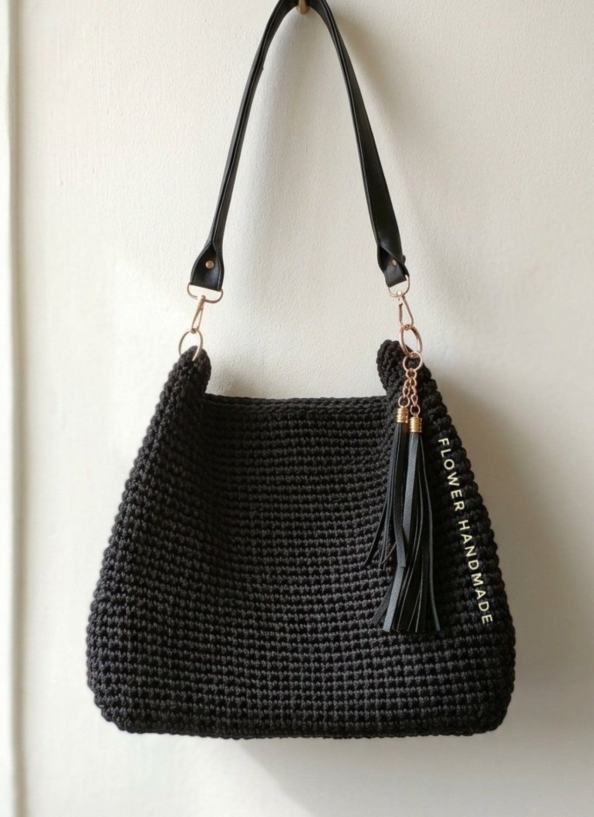 شنطة كروشية ب خيوط القطن بطانه ستان مع يد كتف و كروس جلد مقاس ٤٠ في ٣٥سم