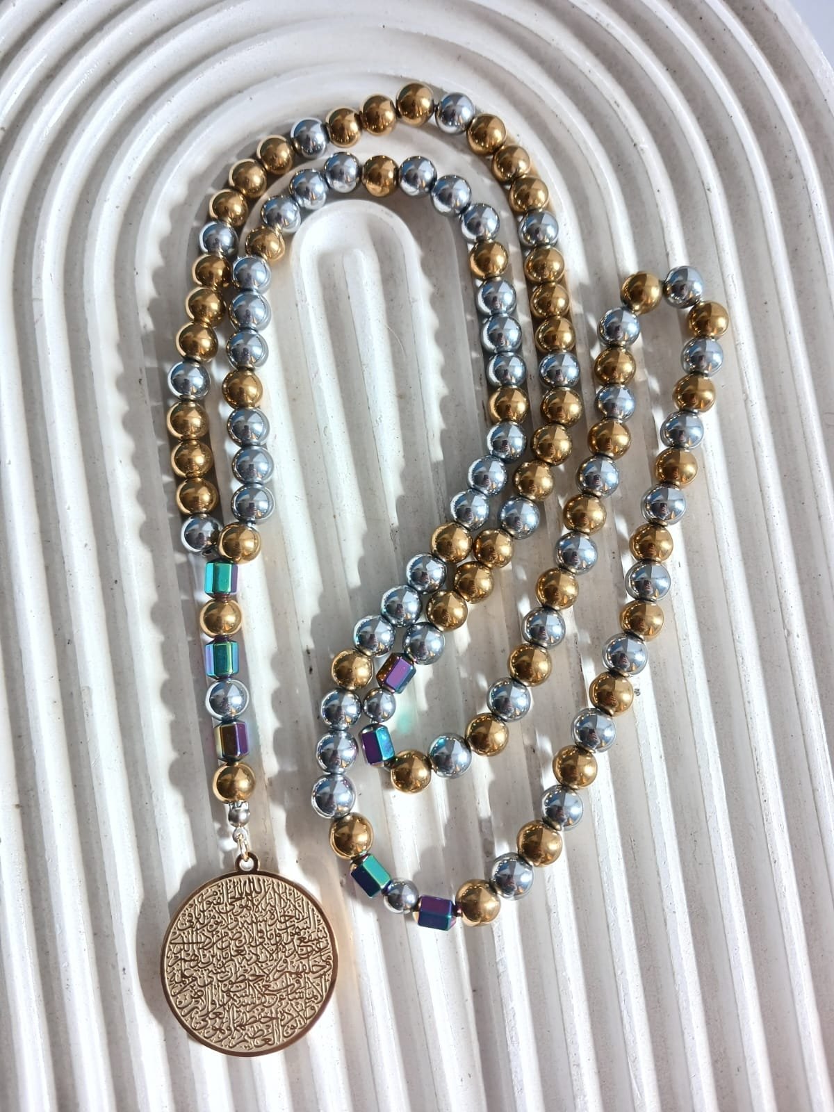 سبحة يدوية فاخرة (99 حبة) من أحجار الهيماتيت بألوان الفضة والذهب. تتوج بدلاية من الستانلس ستيل عالي الجودة المحفور عليها آية الكرسي العظيمة. تصميم مقاوم للصدأ يجمع بين هيبة المعدن وبريق الفواصل الهيماتيت، ليكون رفيقك الدائم في الذكر والحفظ. متوفرة بدلاية باللونين الذهبي والفضي.