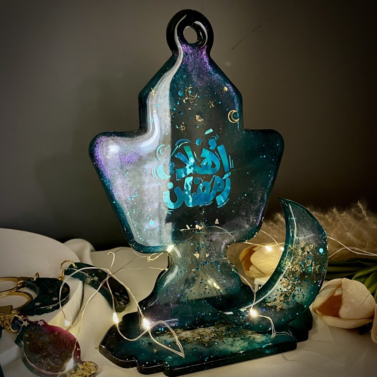 فانوس رمضان استاند باللون الازرق الغامق الشفاف مع تاتش من الوان مميزة بارتفاع ٢٠ سم