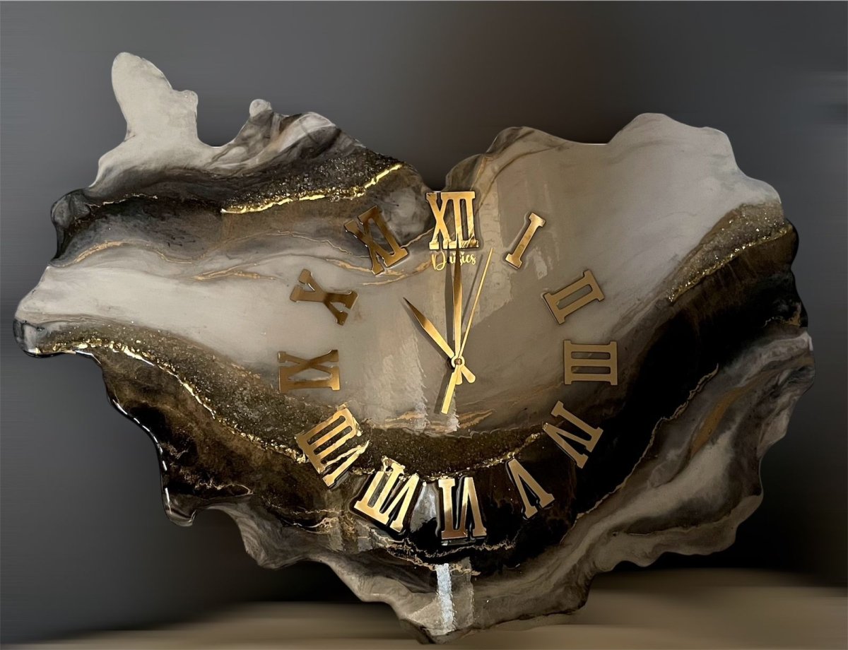 ساعة حائط ريزن بالوان الابيض ودرجات الاسود والدهبي ، مقاس ٥٠ * ٧٠ سم ومزينة بالاحجار