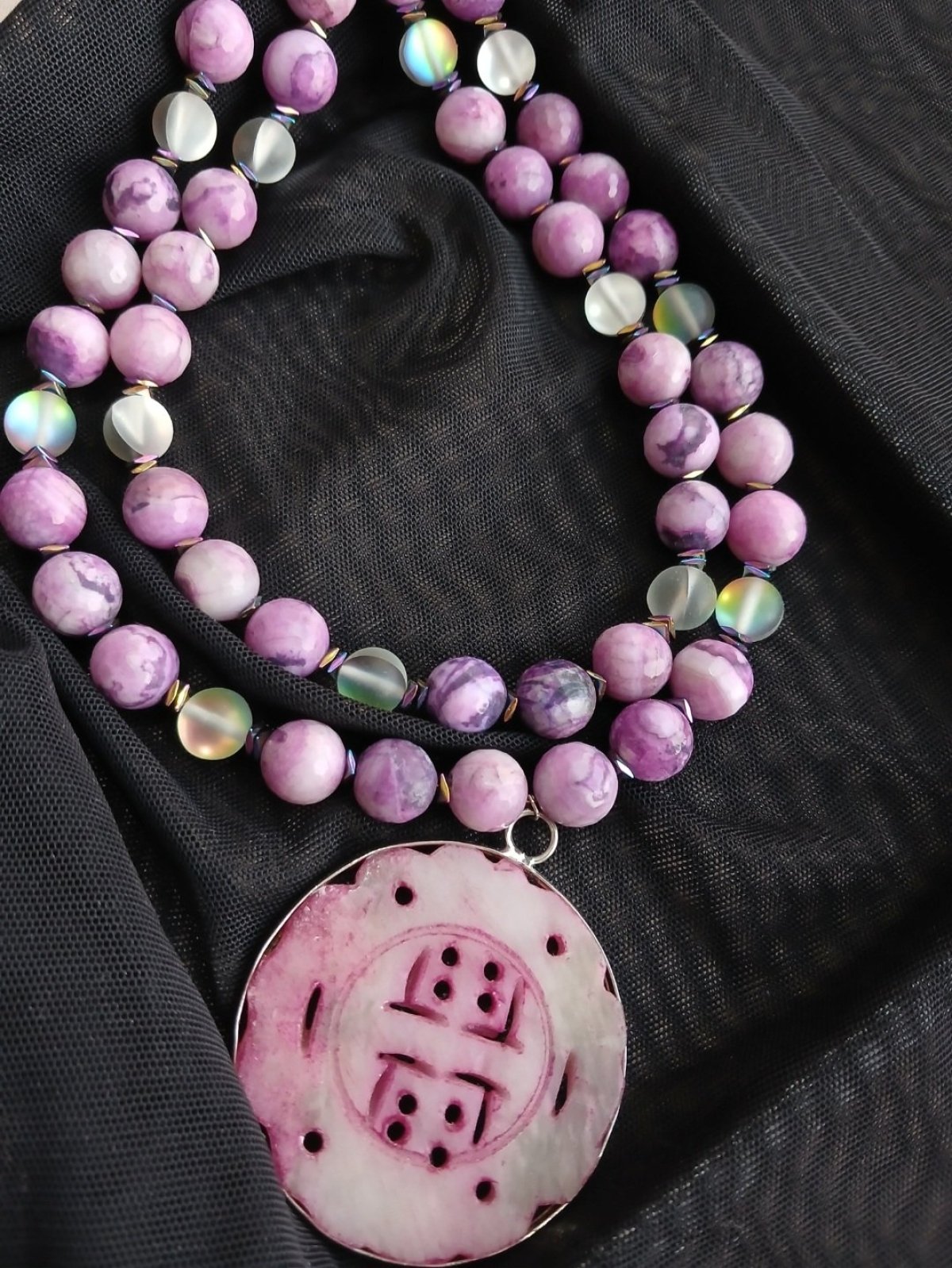 تحفة فنية مزدوجة الطبقات مشغولة يدوياً من أحجار العقيق البنفسجي الفاخر وفواصل الأوبال الحالمة. يتوسط التصميم دلاية ضخمة من العقيق الطبيعي المنحوت، مع لمسات من حجر الهيماتيت المعدني لتضفي طابعاً عصرياً. القلادة مزودة بسلسلة خلفية أنيقة لتعديل الطول، مما يجعلها قطعة استثنائية تمنحكِ إطلالة ملكية مستوحاة من سحر الطبيعة.