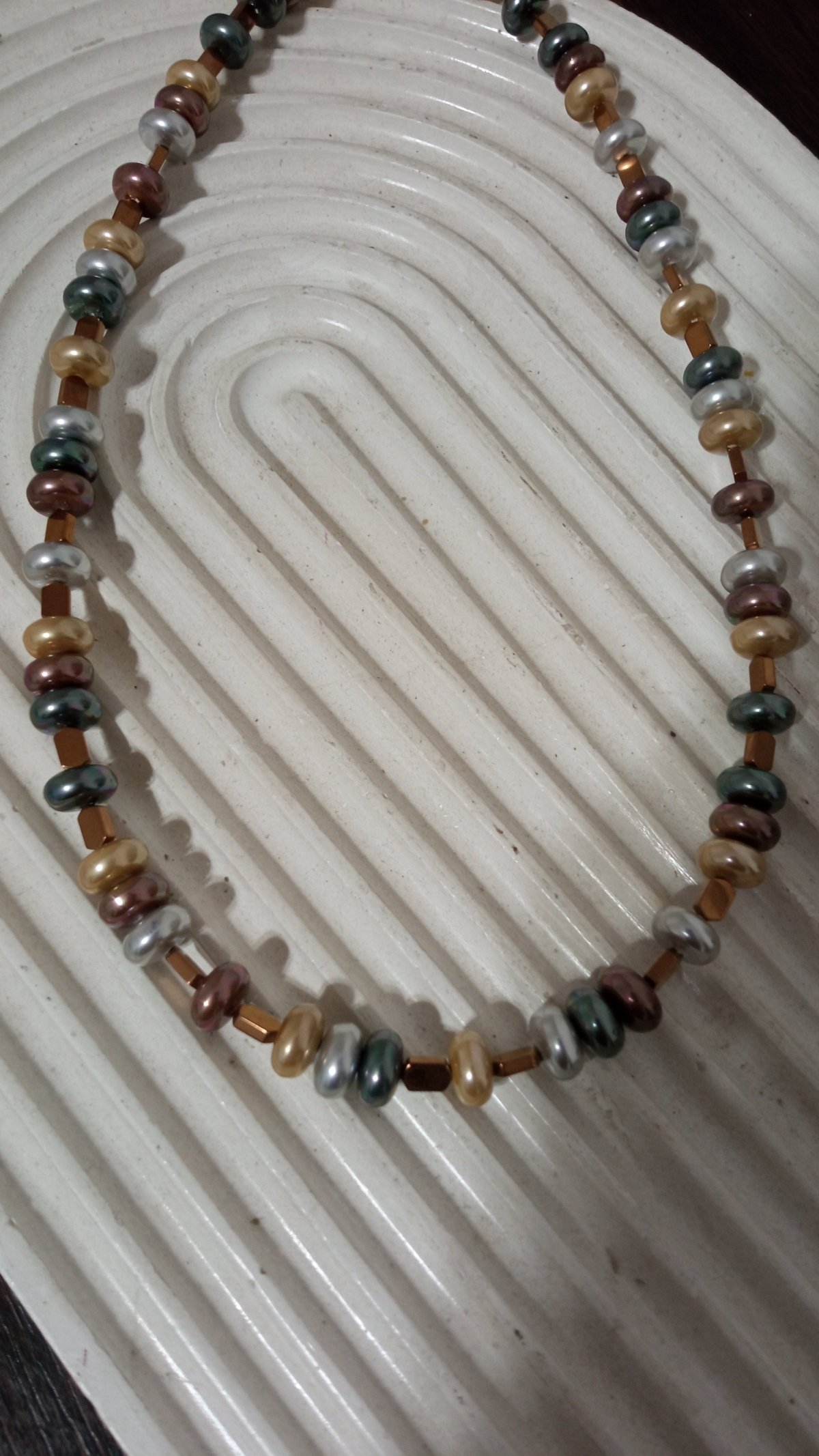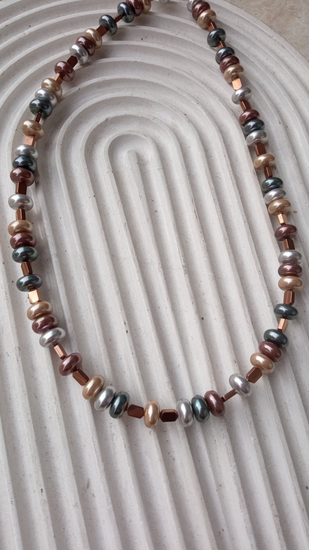 إعادة تعريف عصرية لكلاسيكية اللؤلؤ. تتميز هذه القلادة بتناغم فريد من لؤلؤ شل بألوان ميتاليك غنية، تفصل بينها فواصل هندسية من حجر الهيماتيت بلونه النحاسي الدافئ. صُممت يدوياً لتمنحكِ إطلالة قوية وراقية في آن واحد، مع سلسلة خلفية قابلة للتعديل لتناسب كافة الأذواق.