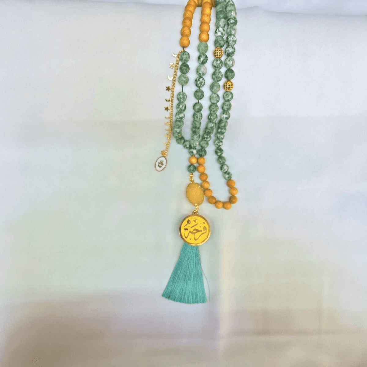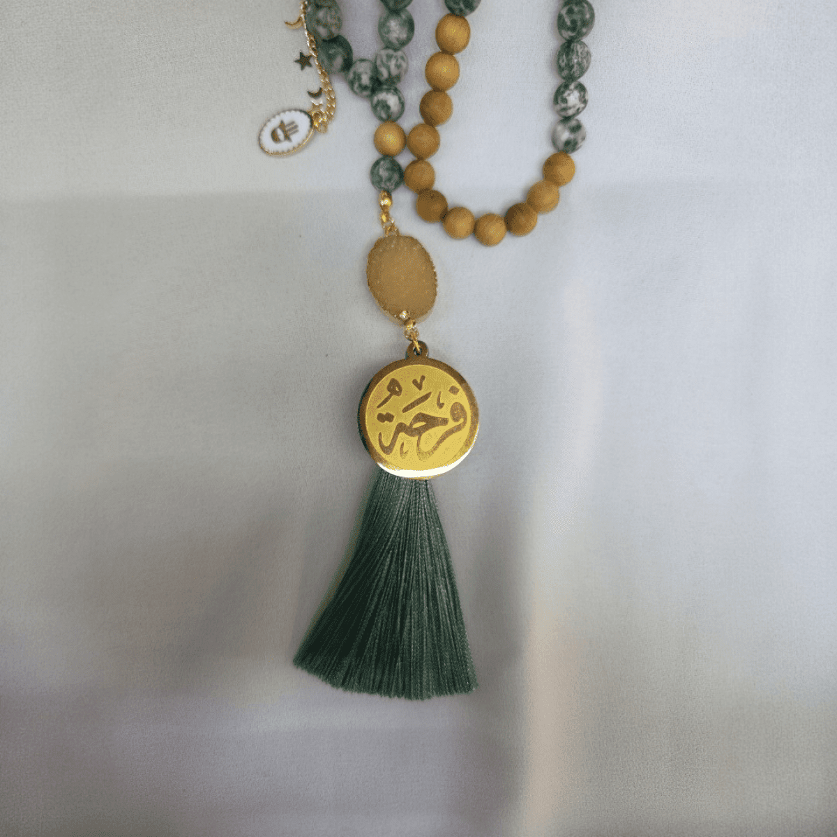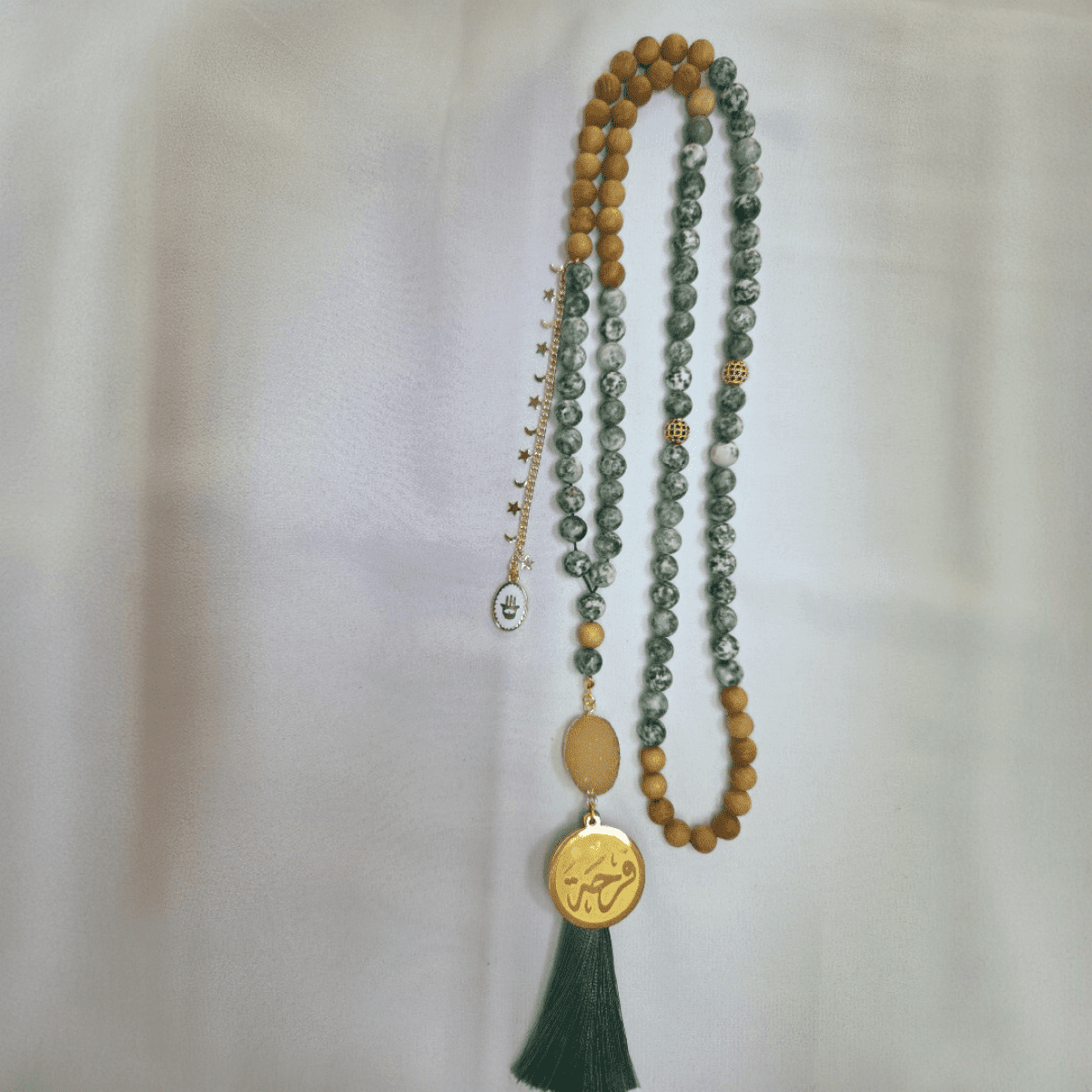 سبحة من حجر العقيق والخشب الطبيعي، تتضمن فواصل وسلسلة جانبية مع دلاية من الذهب الصيني، بالإضافة إلى دلاية أساسية من الاستانلس ستيل المطلي بالذهب وشرشوبة حرير